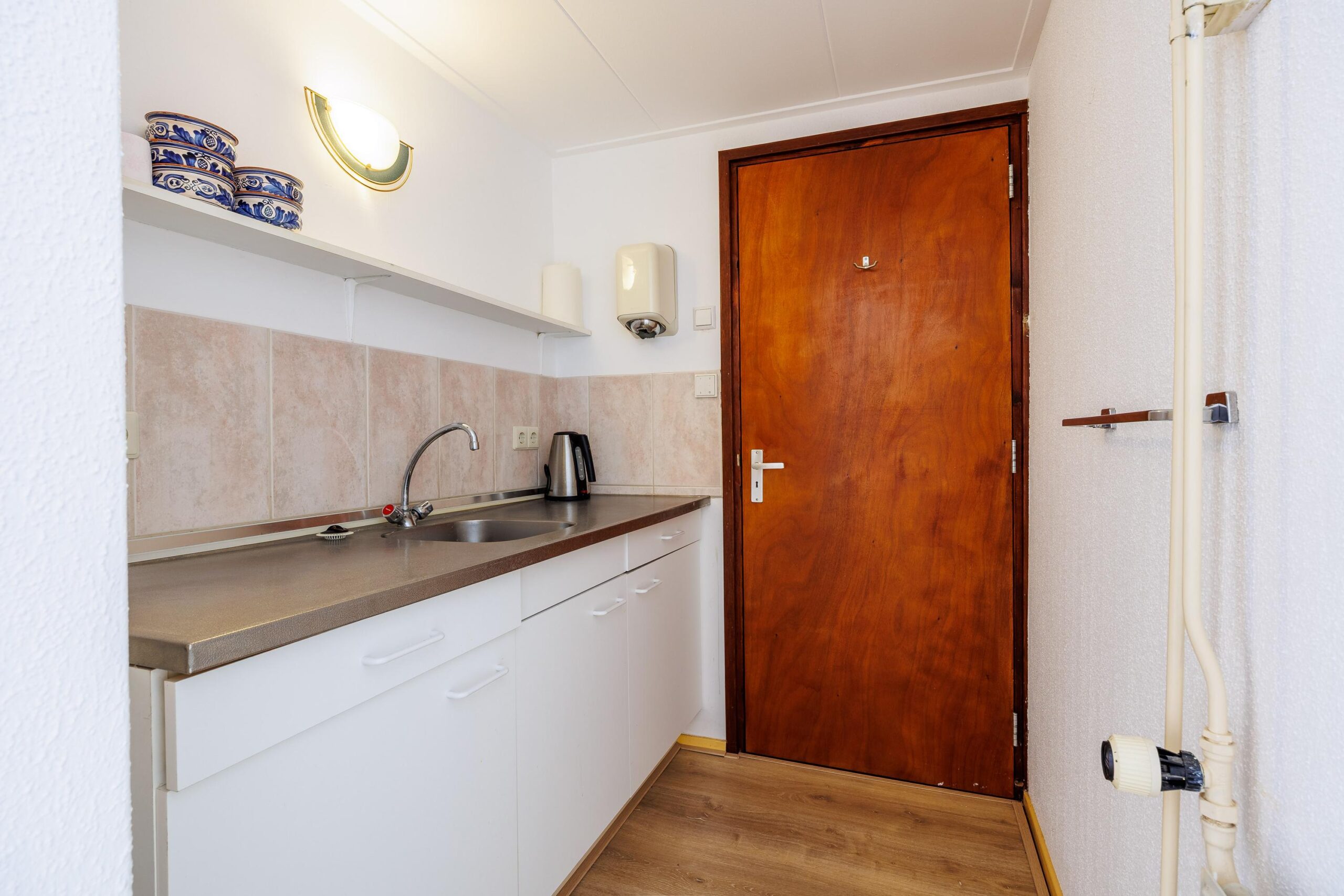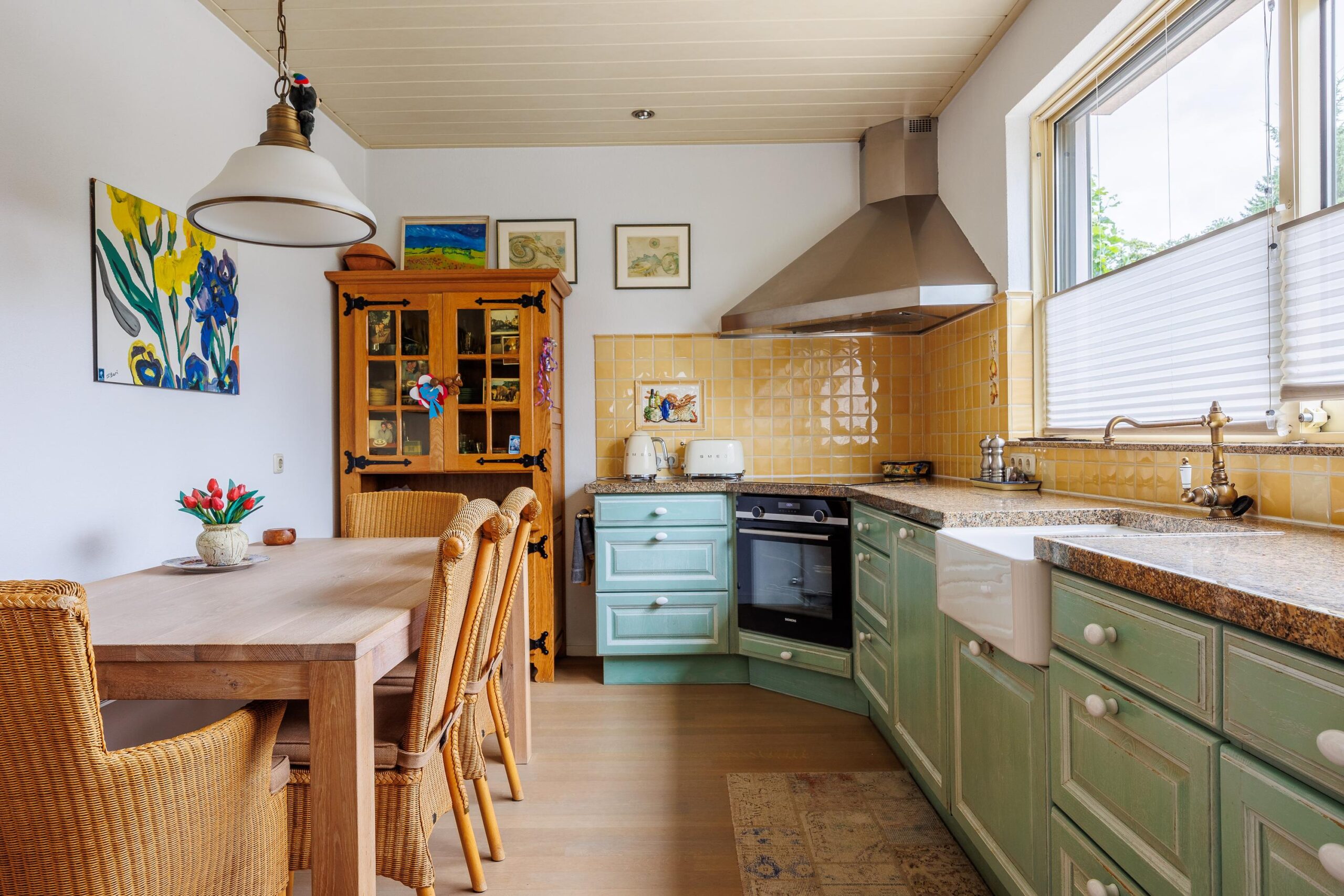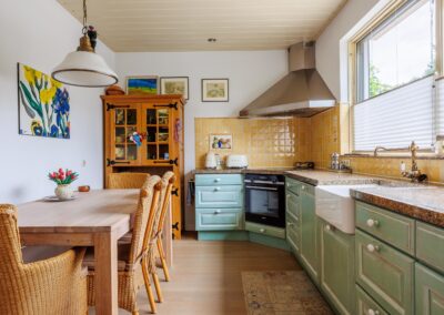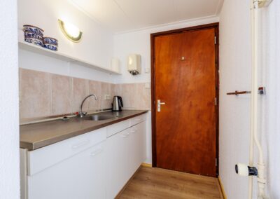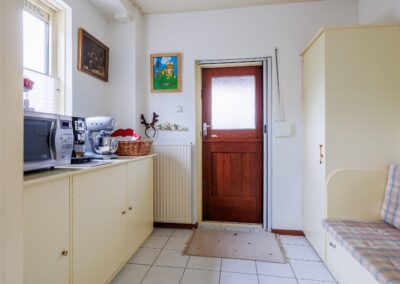 In een aparte ruimte vind u de keuken, deze is voorzien van een oven, inductiekookplaat, vaatwasmachine, Smeg koelkast en voldoende opbergruimte. Vanuit de keuken is er toegang tot de bijkeuken, welke is voorzien van op maat gemaakte kasten. Vanuit de bijkeuken kunt u naar de zijkant van de woning toe.