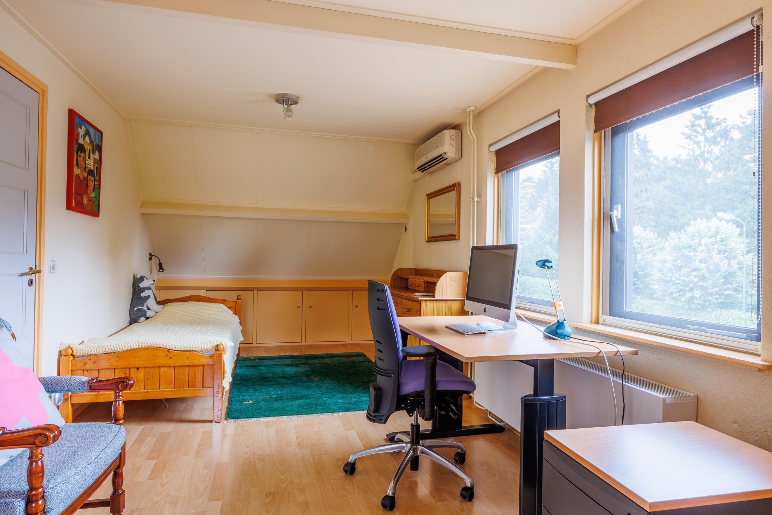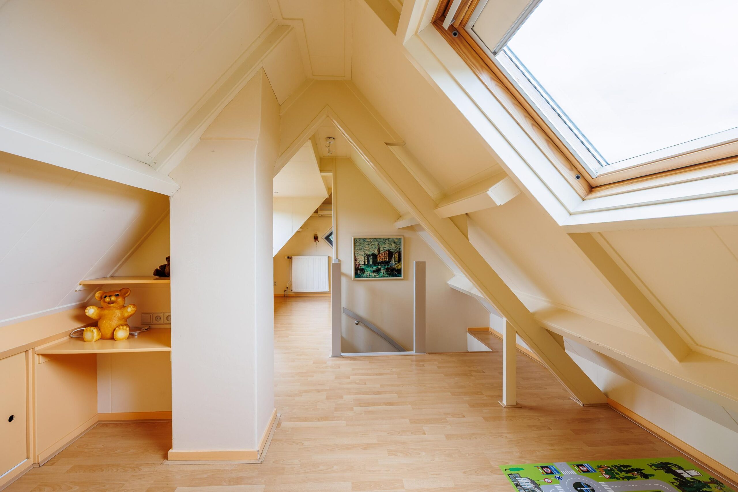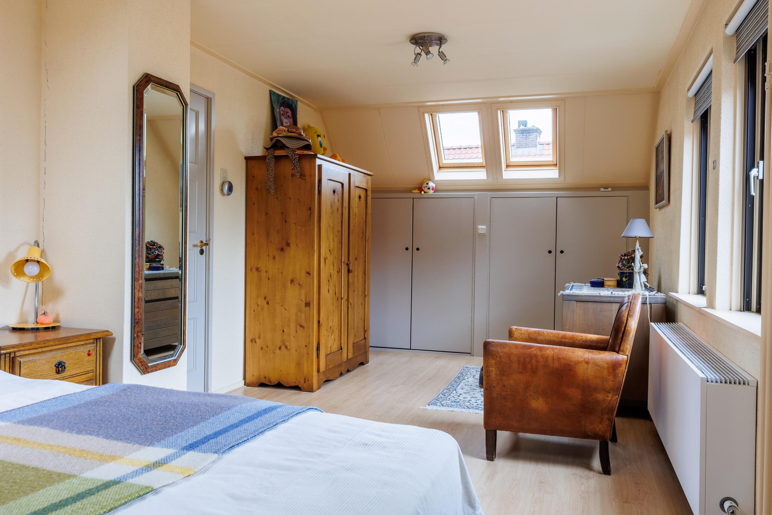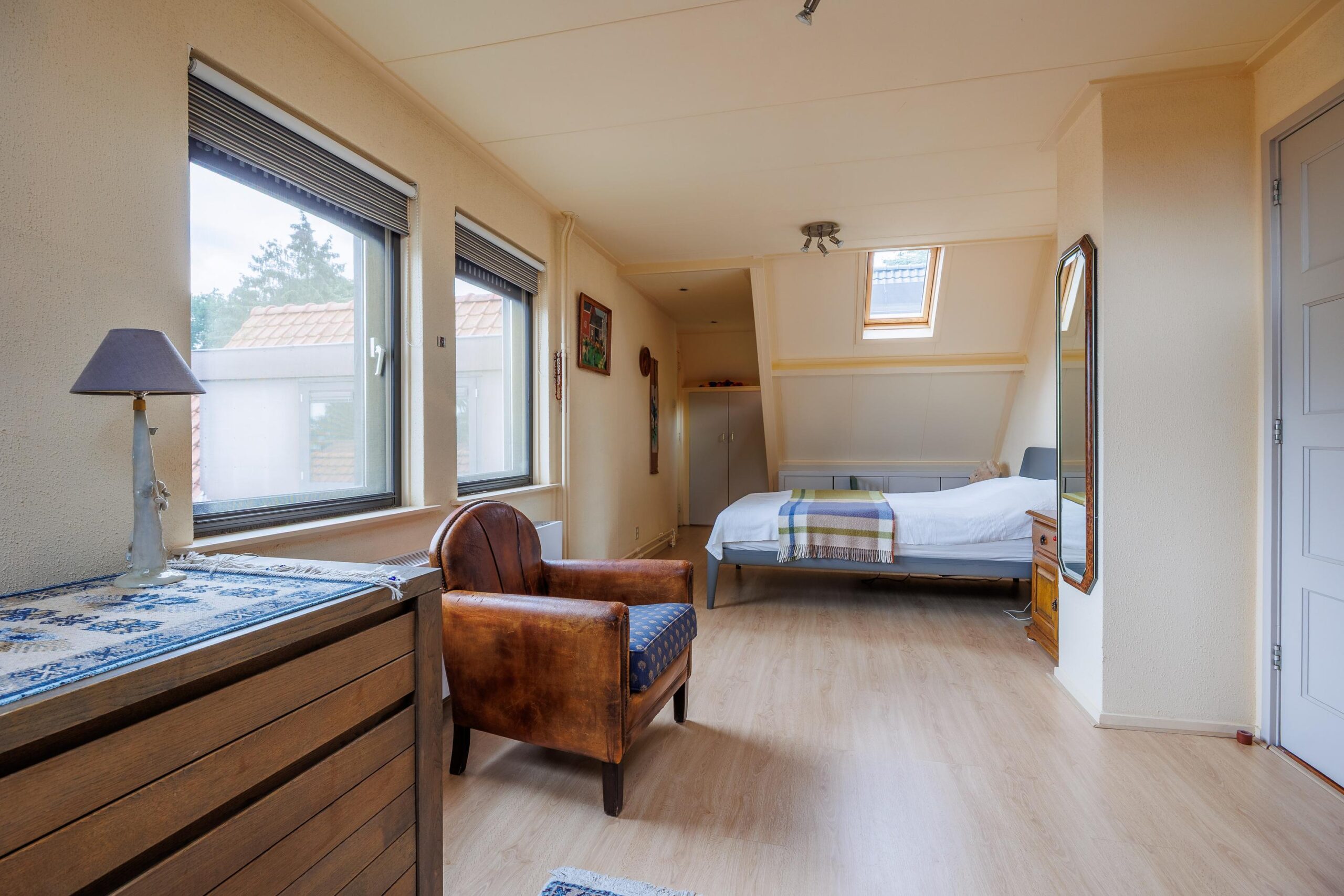 Tweede verdieping: Via vaste trap naar 2e verdieping, grote ruimte met 4e slaapkamer en inbouwkasten, voorzien van airconditioning.