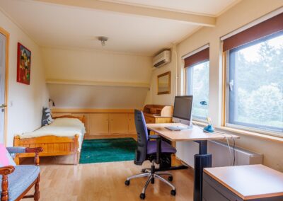 Het vrijstaande bijgebouw in de tuin is voorzien van een eigen ingang, 2 kamers, een (eenvoudige) keuken, (eenvoudige) badkamer, eigen CV, airconditioning en berging (voorheen praktijkruimte) en een zolder.