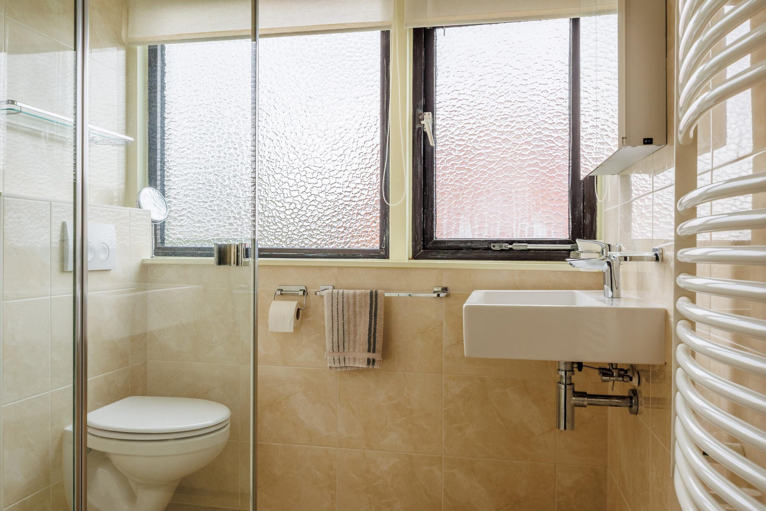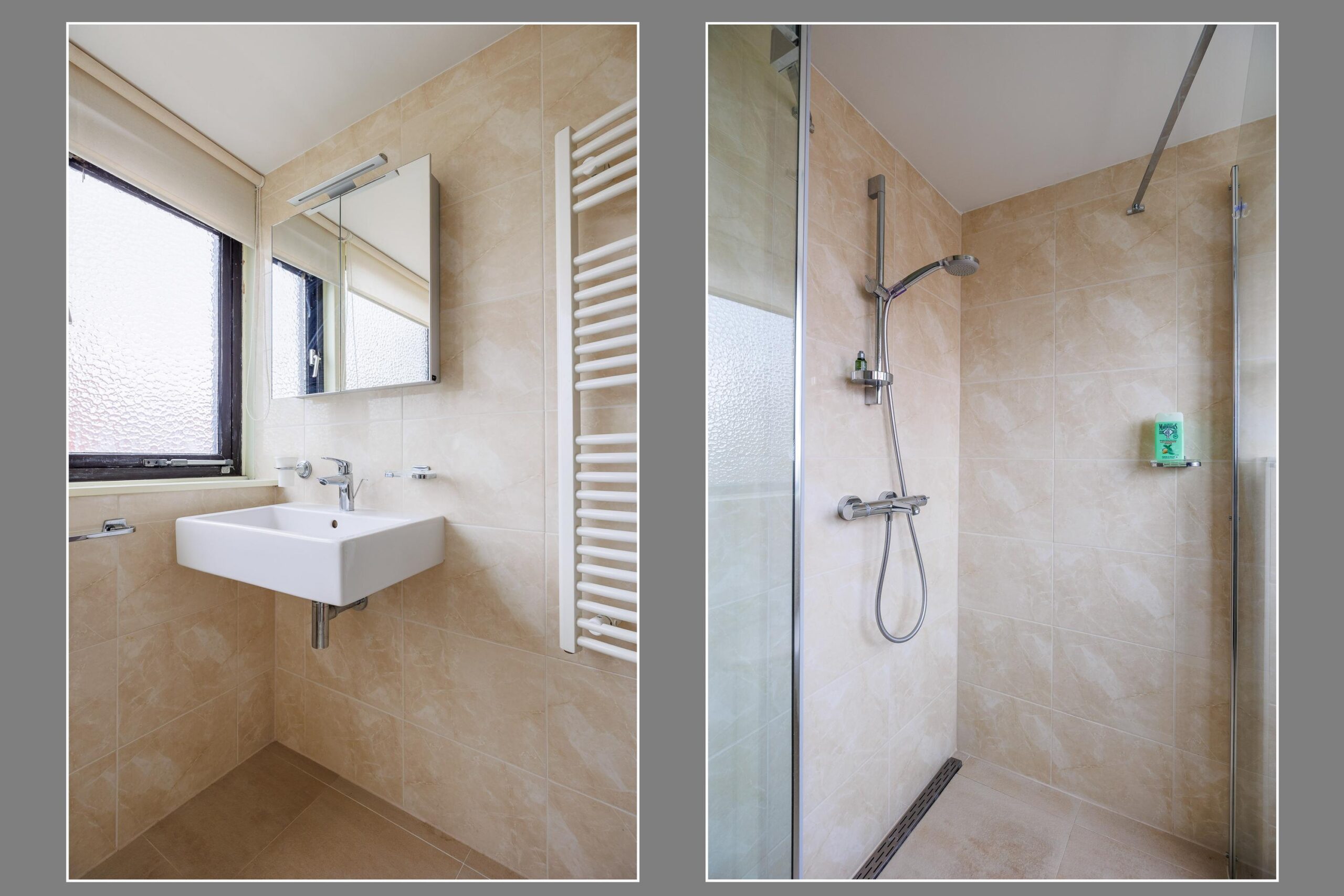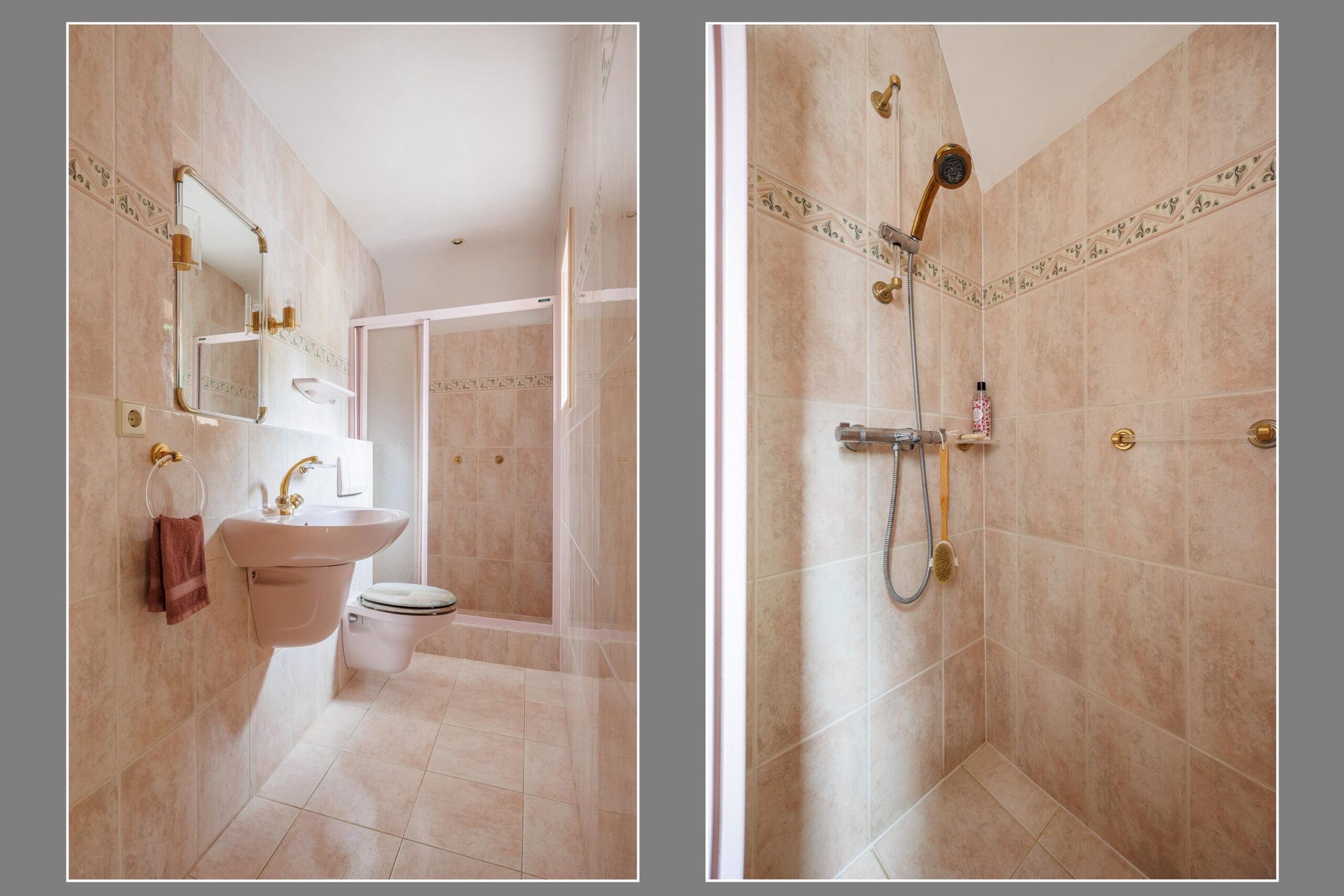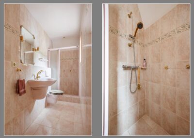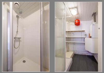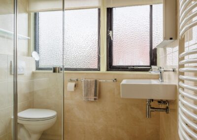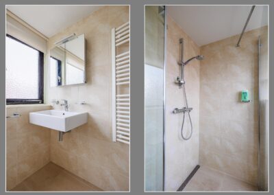 De badkamer op de begane grond is voorzien van een douche, wastafel en toilet.
