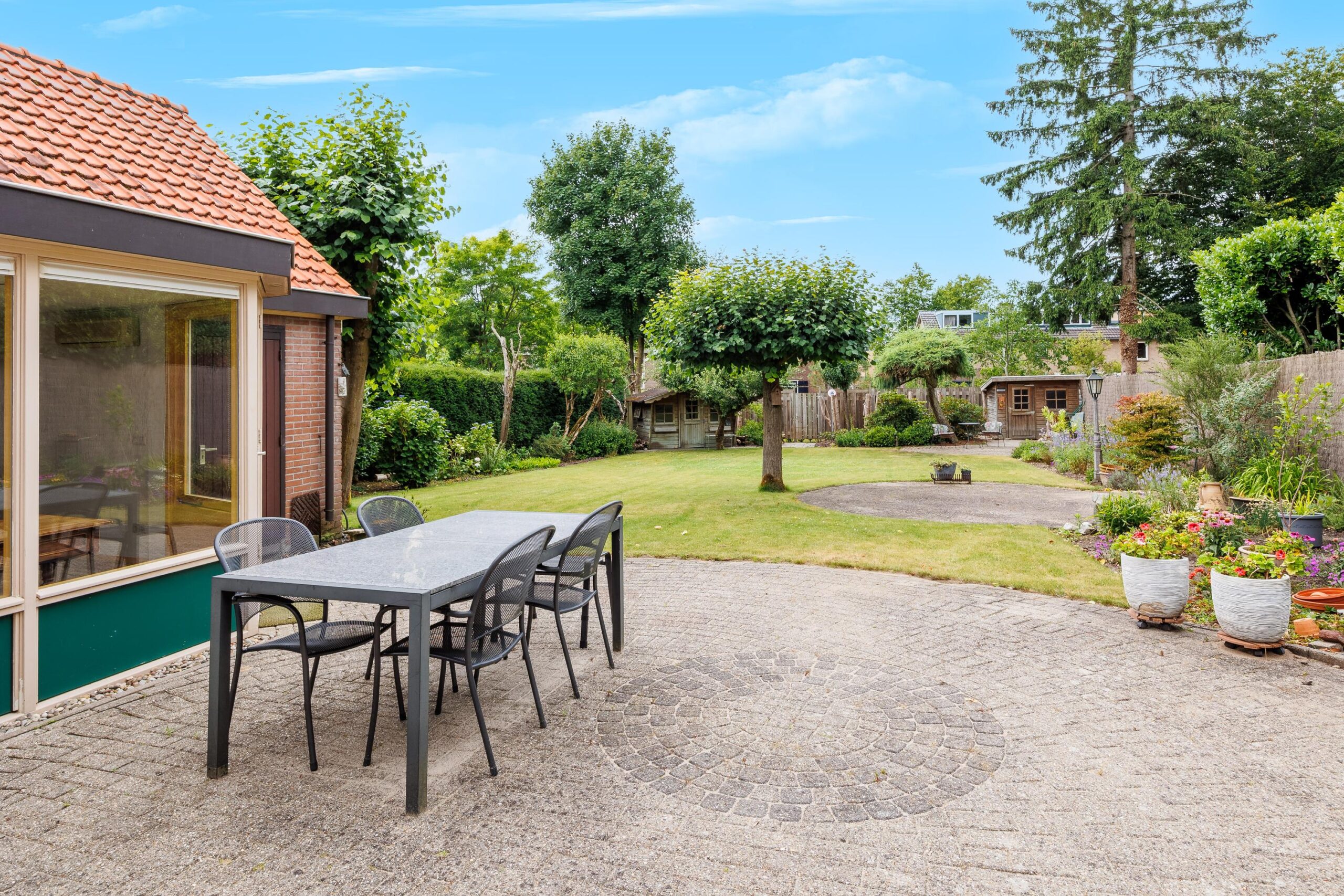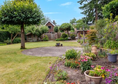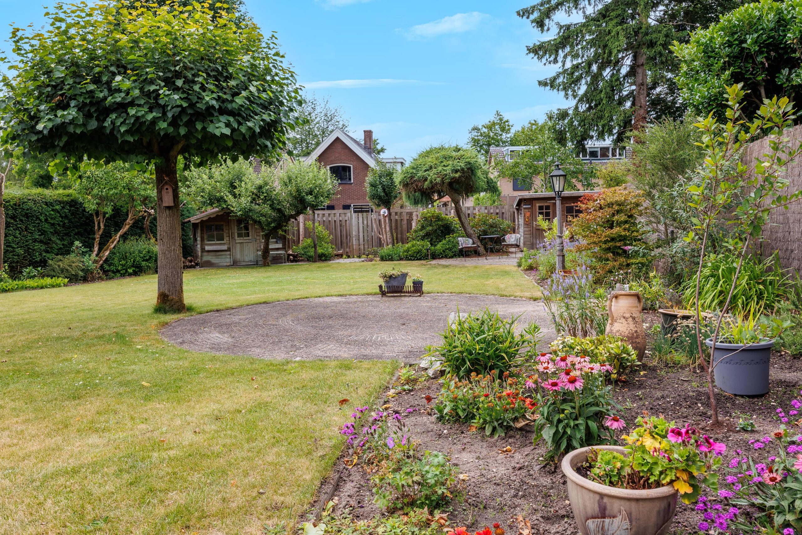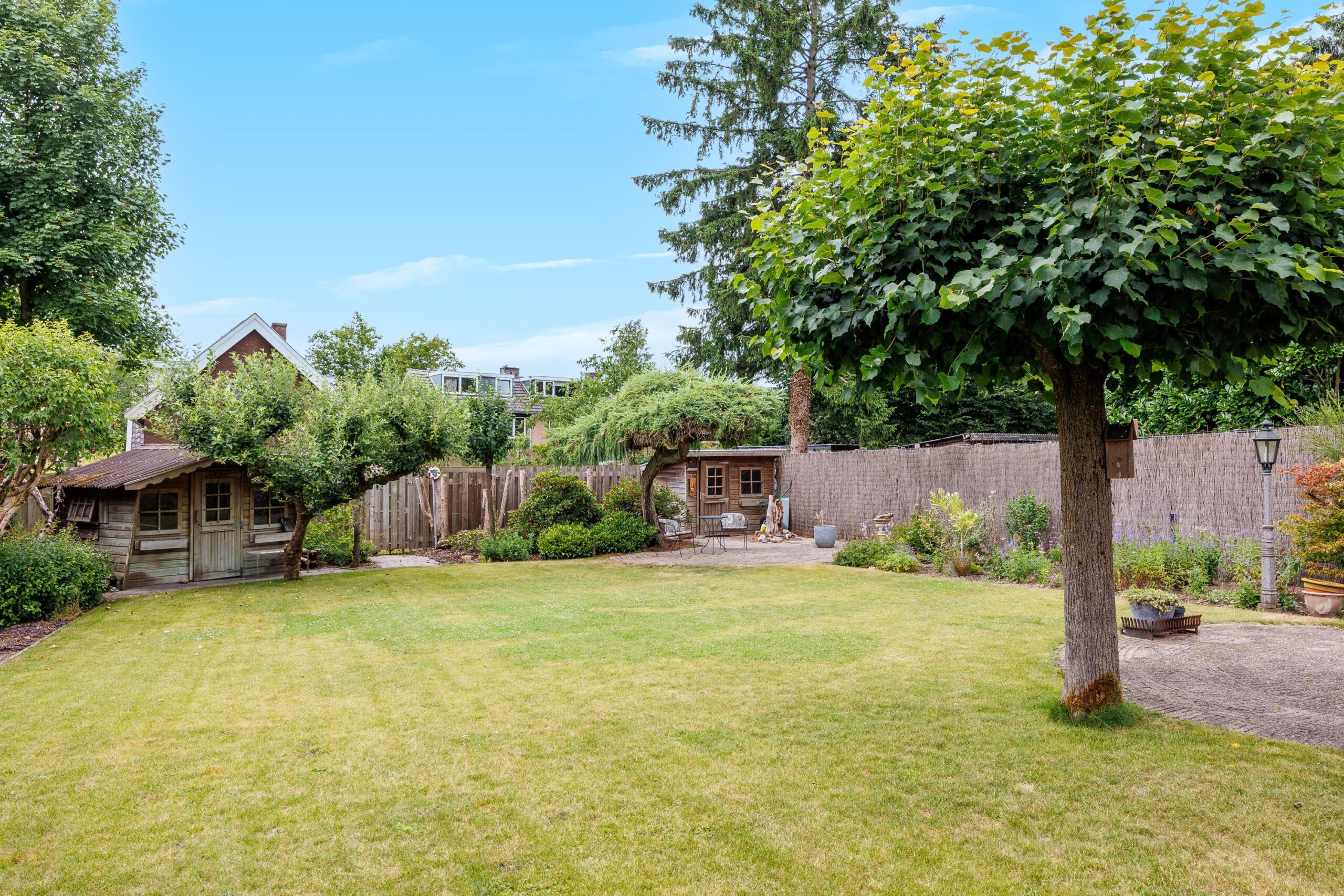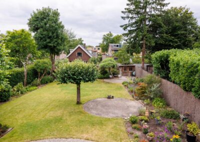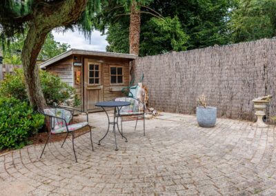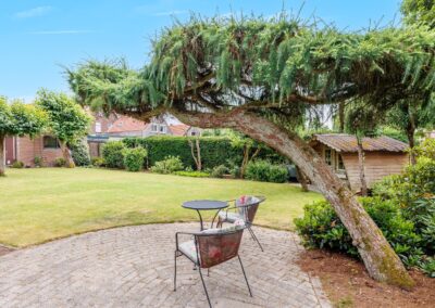 De royale tuin is een waar groen paradijs: ruim opgezet gazon, met meerdere zitjes in zowel zon- als schaduwplekken die volop privacy bieden. Hier kun je in alle rust genieten van het buitenleven. In de tuin zijn ook nog twee vrijstaande houten bergingen te vinden, ideaal om tuinkussens of tuingereedschap in op te bergen. De tuin is voorzien van een beregeningsinstallatie.