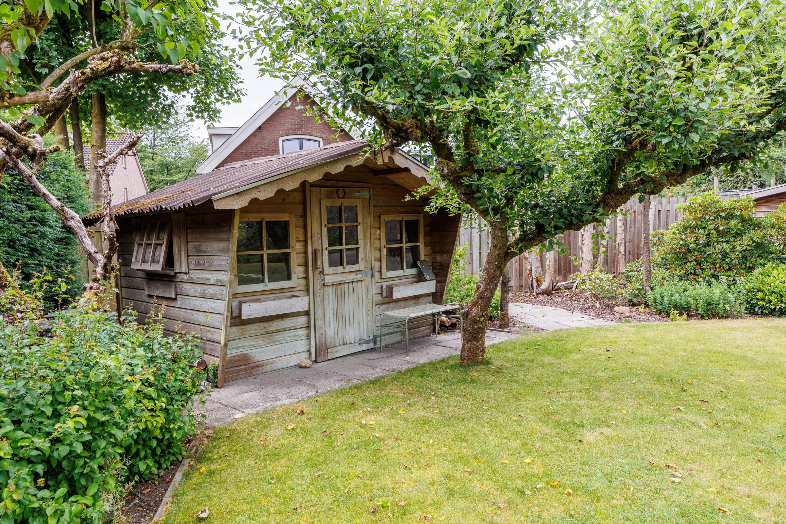 Twee vrijstaande houten bergingen in de tuin.