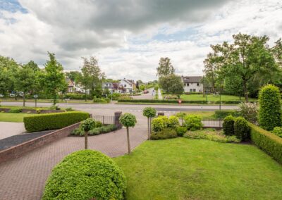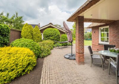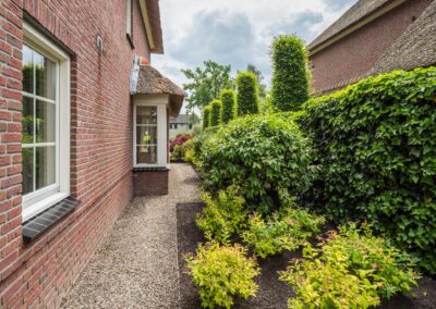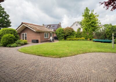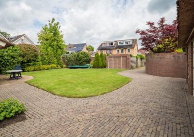 De royale achtertuin en mooi ingericht met gazon, bloemborders en terras. Het beidt voldoende privacy en is een heerlijke plek om te genieten van de rust en ruimte die het biedt. De voortuin heeft een grote oprit met een elektrisch bedienbare sierhek. De achtertuin heeft een eigen toegang (voor de auto) naar de achterliggende straat.