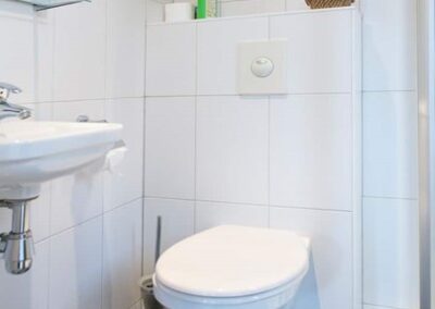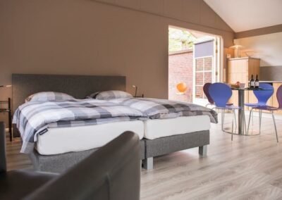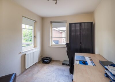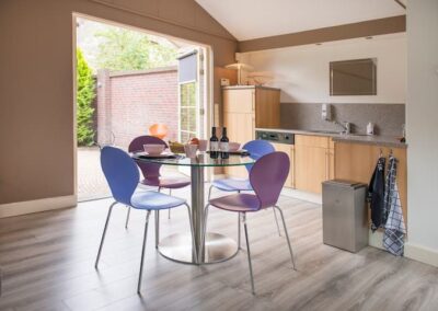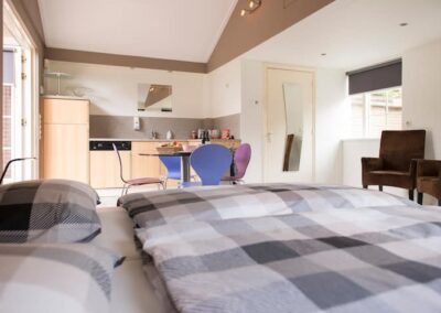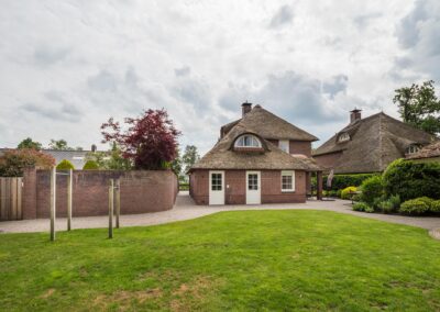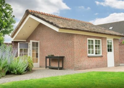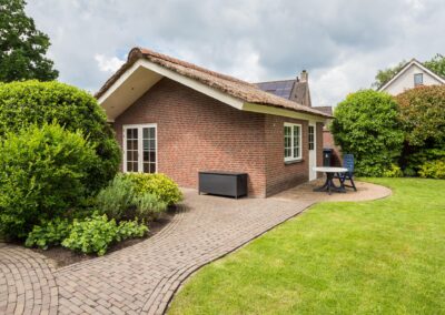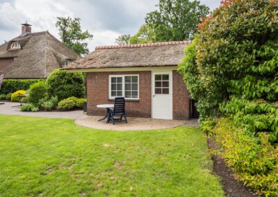 Het vrijstaande bijgebouw achter in de tuin is geheel in dezelfde stijl gebouwd als de woning, wordt nu gebruikt als gastenverblijf, maar is ook uitermate geschikt om te gebruiken als kantoor/praktijk aan huis of mantelzorg. Het is volledig geïsoleerd en ingedeeld met een hoofdvertrek van circa 21 m² met openslaande deuren naar de tuin, een keuken van 7 m² met keukenblok voorzien van dubbele spoelbak, vaatwasmachine en koelkast en een kleine badkamer met douche, vaste wastafel en toilet.