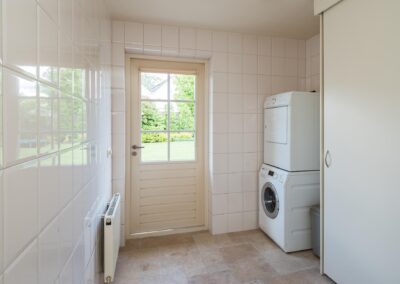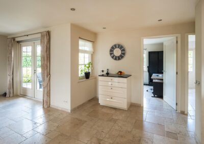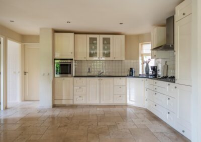 ENTREE middels een ruime ontvangsthal met vide, trapopgang naar de verdieping, meterkast en toiletruimte met fonteintje. De royale woonkamer van ruim 68 m² heeft veel lichtinval door de vele ramen met prachtig uitzicht op de tuin en biedt veel leefruimte en een gezellige gashaard. De grote woonkeuken heeft openslaande deuren naar het terras en is uitgerust met een landelijke inbouwkeuken voorzien van hardstenen aanrechtblad en diverse inbouwapparatuur waaronder een 4-pits gaskookplaat, afzuigkap, dubbele spoelbak, vaatwasmachine, koelkast, vriezer en een combi-oven. Verder is er een bijkeuken met witgoedaansluitingen, vaste kastenwand en een achterdeur naar de tuin. Separate hobby-/ werkkamer van circa 10 m2. De gehele begane grond voorzien van een Travertin tegelvloer met vloerverwarming.