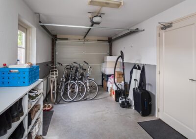 De inpandige garage is voorzien van een elektrische roldeur, een wastafel en heeft een deur naar de woning en een deur naar de tuin.