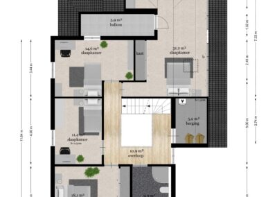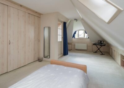 Vaste trap naar de 2e verdieping, overloop met bergkast, 2 slaapkamers met dakkapel en bergruimte, ruime kamer die de mogelijkheid biedt voor het realiseren van een 7e slaapkamer.