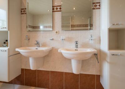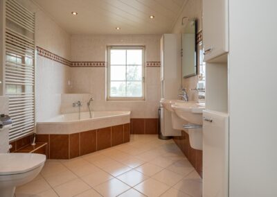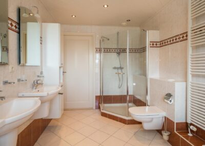Overloop met separate CV-ruimte, 4 ruime slaapkamers, waarvan er 2 beschikken over een vaste kastenwand en 1 ervan geeft toegang tot het balkon, de badkamer is ingericht met 2 wastafels, een ligbad, separate douche en een toilet.