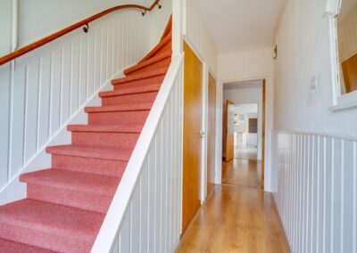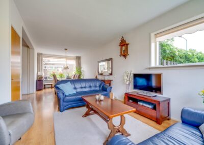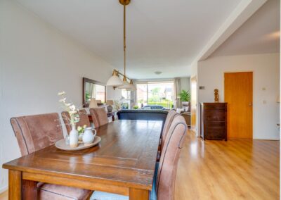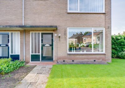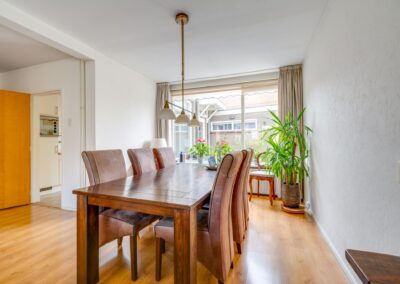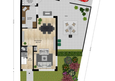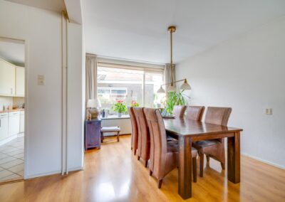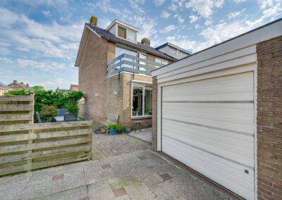 Begane grond: ENTREE, hal met trapopgang naar 1e verdieping, trapkast met groepenkast en de toiletruimte. Vanuit de hal bereik je de lichte en uitgebouwde woonkamer van 36,3 m² met fraaie laminaatvloer en lichte wanden. Aansluitend een aangebouwde keuken (2002) met 4-pits gasplaat, afzuigkap, vaatwasser en koelkast. Vanuit de keuken is de bijkeuken bereikbaar voor eventuele wasmachine – en/of drogeropstelling en deur naar de tuin. Vanuit de bijkeuken is ook inpandige te toegang naar de ruime garage van 18,6 m². De garage is voorzien van elektrisch bedienbare sectional-deur en raampartij. Er is een eigen oprit voor de garage met plek voor 1 auto.