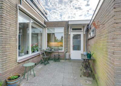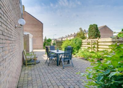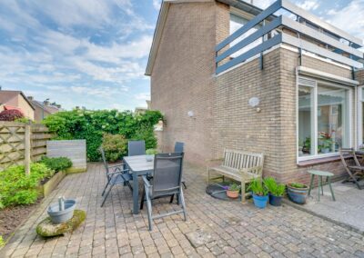Er is een zonnig terras aan de achterzijde van het huis gelegen op het zuiden. Het grootste deel van de tuin is aan de zijkant van de woning met een ligging op het westen, eveneens met een zonnig terras met aansluitend keurig aangelegde tuin.