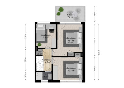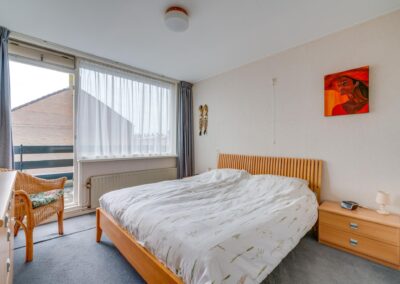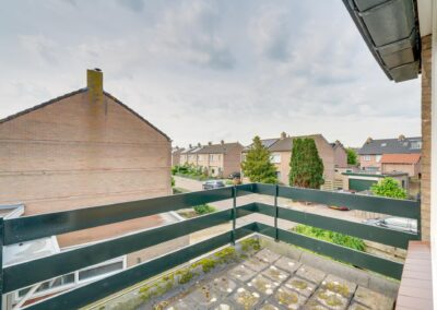 1e Verdieping: Overloop met toegang naar 3 slaapkamers waarvan de hoofdslaapkamer van 12,1 m² een eigen dakterras/balkon heeft. De andere 2 kamers zijn 10,7 en 7,2 m² groot. De betegelde badkamer is ingericht met wastafelmeubel en douche. Op deze woonlaag zijn meerder inbouwkasten aanwezig.