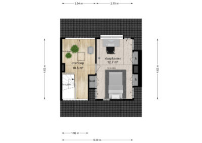 2e Verdieping: Middels vaste trap bereikbare zolderverdieping bestaande uit overloop met dakraam en bergruimte, aansluitend een ruime 4e slaapkamer van 12,7 m² met dakkapel en eveneens bergruimte in kasten en schotten.
