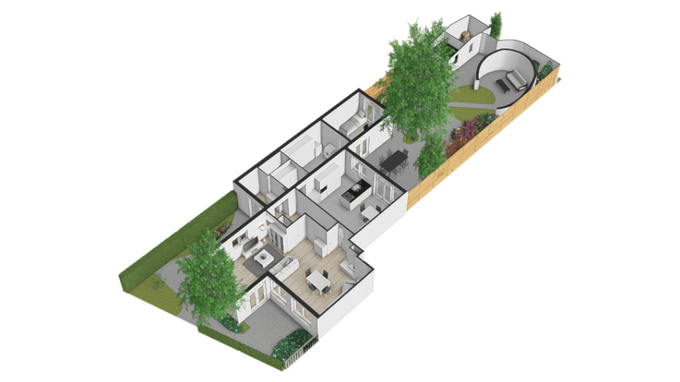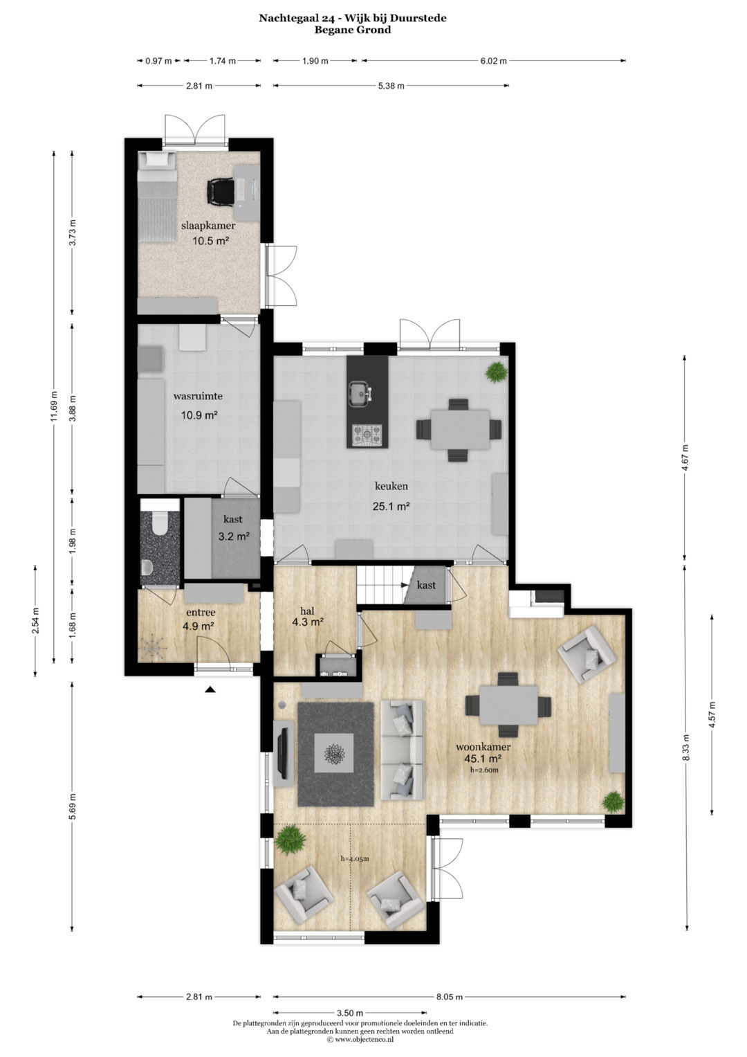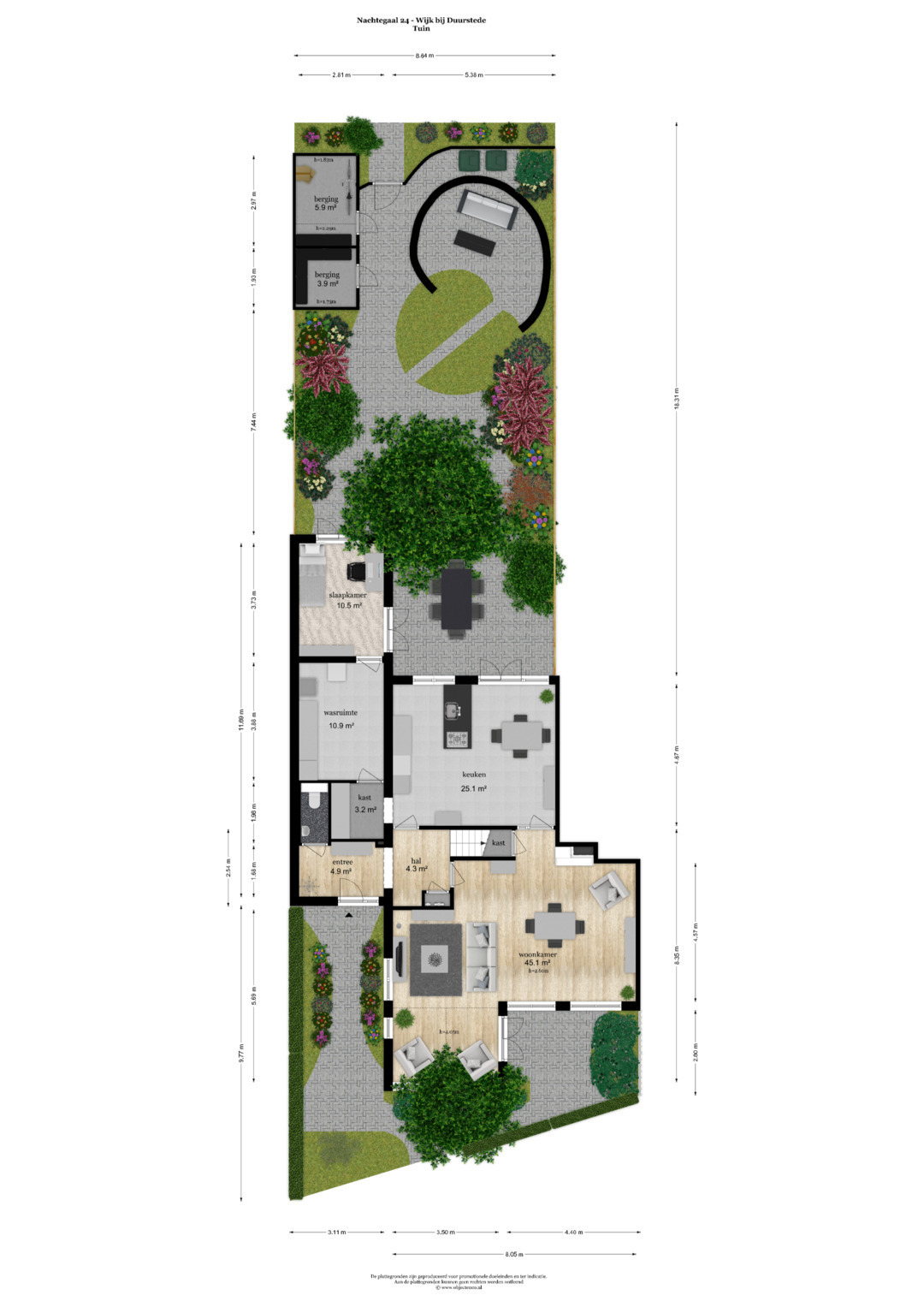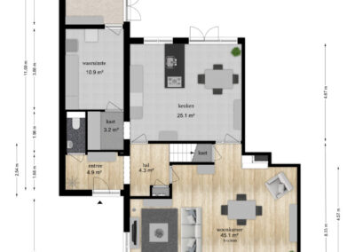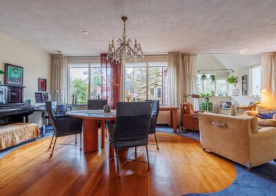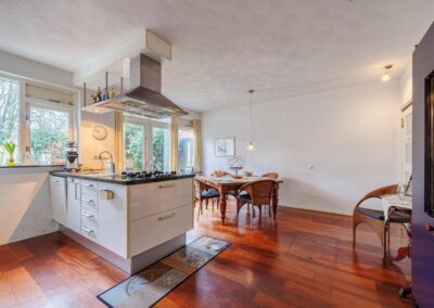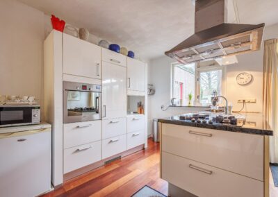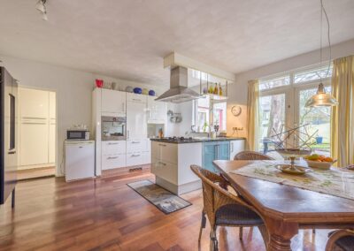 Begane grond: ENTREE met hal en toilet. Vanuit de hal toegang tot de ruime living met aangebouwde tuinkamer (samen 45.1 m² groot) met veel lichtinval en openslaande deuren naar de voortuin. Deze fijne kamer biedt volop ruimte voor een comfortabele zithoek maar ook naar wens in te delen met extra zitjes zoals een leeshoek of hobbyhoek. De keuken van 25.1 m² staat in directe verbinding met de woonkamer en is ingericht als volwaardige leefkeuken met kookeiland en ruimte voor een grote eettafel. Ook vanuit de keuken is er middels openslaande deuren toegang naar buiten, maar nu naar de achterzijde. Aan de achterzijde bevindt zich een slaap-/werkkamer van 10.5 m², ideaal voor gelijkvloers wonen, werken aan huis of als logeerkamer. Aansluitend ligt de praktische bijkeuken/wasruimte van 10.9 m² met witgoedaansluitingen en extra bergruimte.