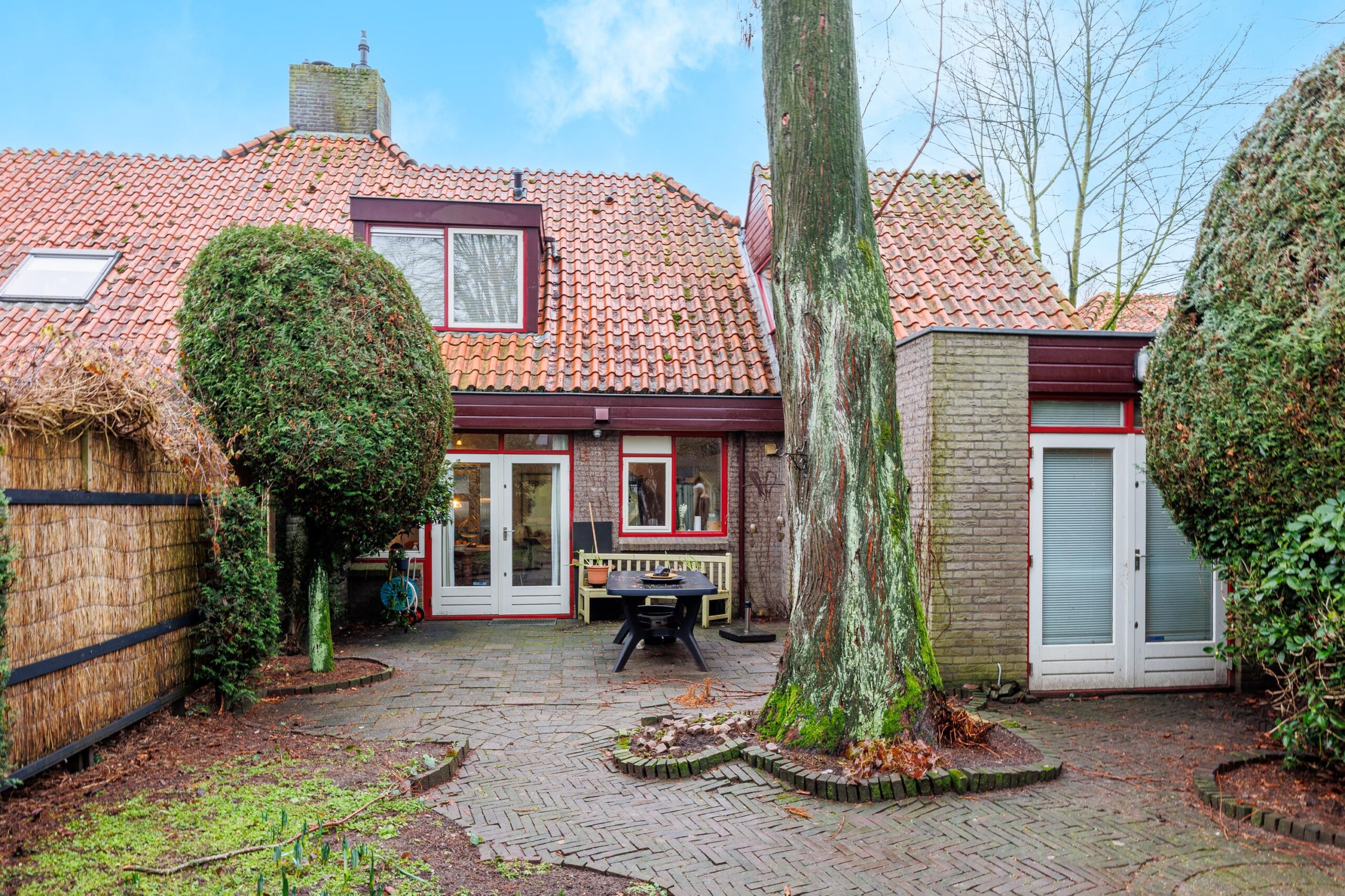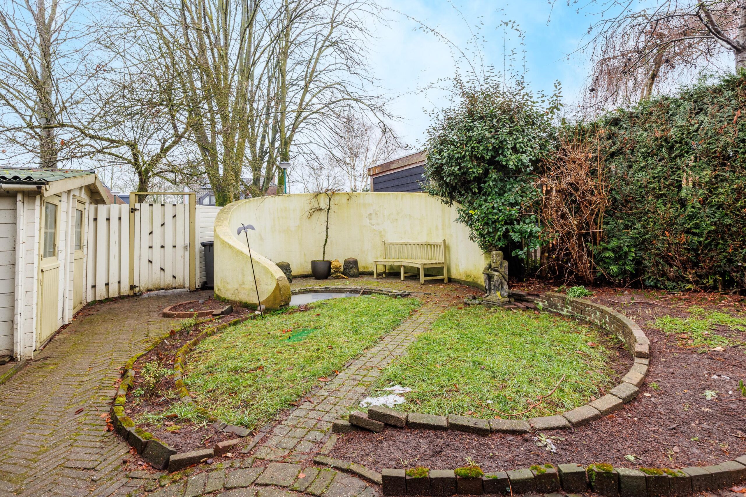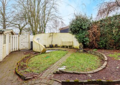 De achtertuin is fraai aangelegd en voorzien van meerdere terrassen, diverse heesters, bomen en een gazon. Achterin de tuin is een houten tuinhuis alsmede een achterom aanwezig.