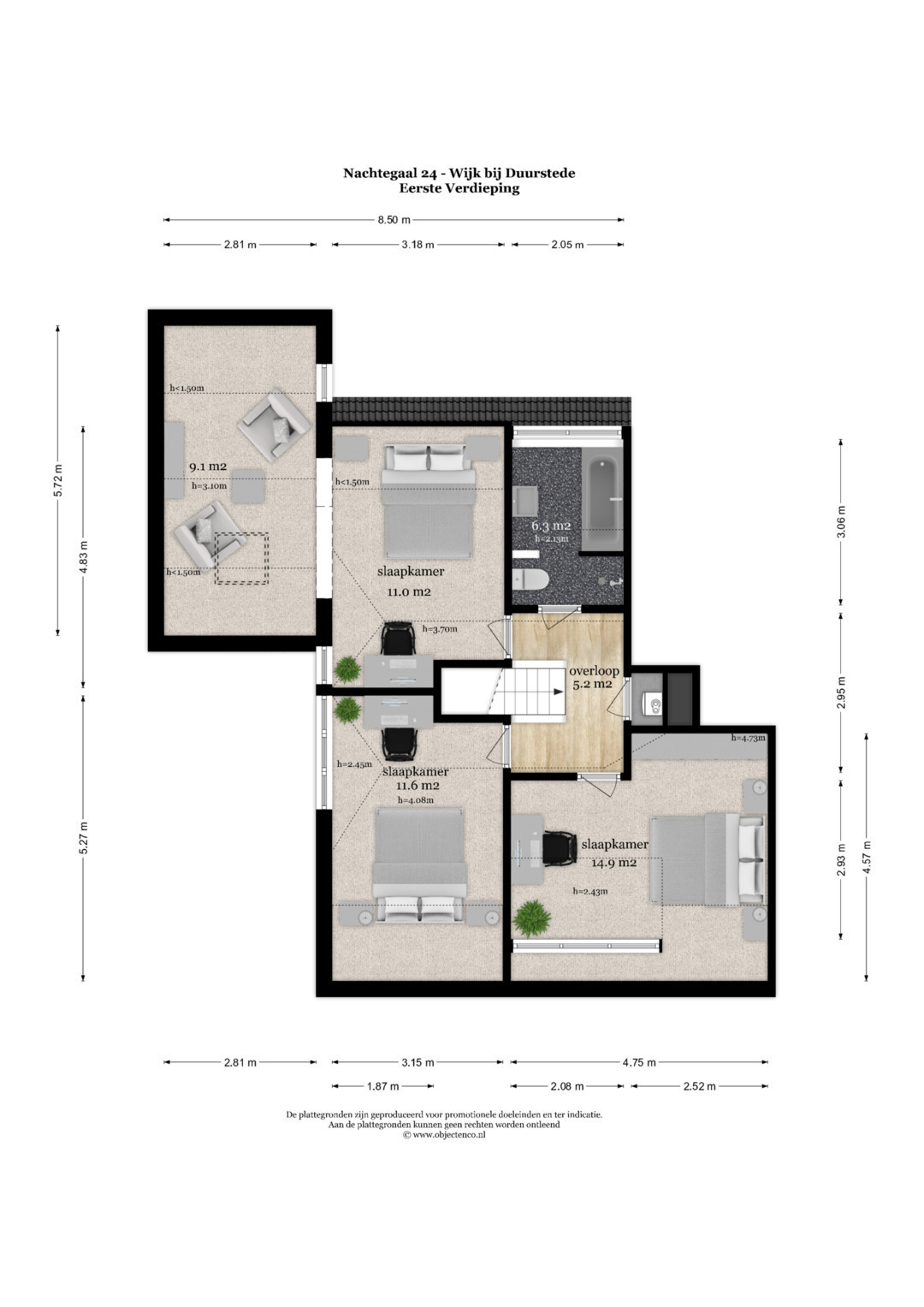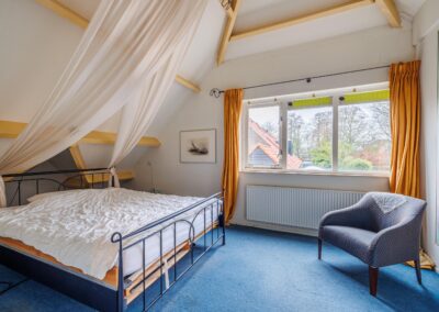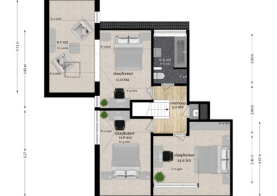1e Verdieping: Overloop met trapopgang, CV-opstelling en toegang tot alle vertrekken. Op deze verdieping bevinden zich 3 slaapkamers van mooi formaat, variërend van 20.1, 11.6 en 14.9 m². De hoofdslaapkamer is ruim opgezet en biedt voldoende plaats voor een tweepersoonsbed en kastruimte. De overige slaapkamers zijn eveneens royaal en multifunctioneel inzetbaar. De badkamer van 6.3 m² is centraal gelegen en voorzien van ligbad, douche, wastafel en toilet.