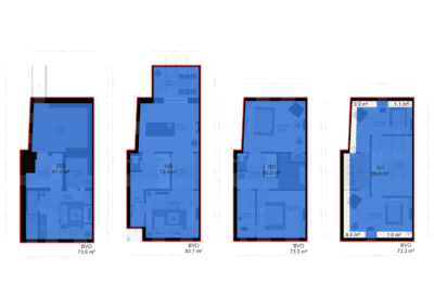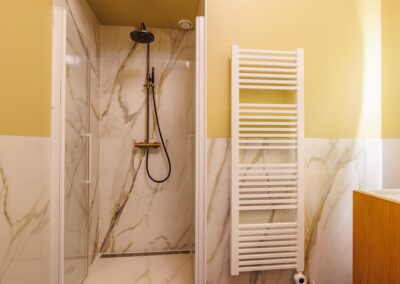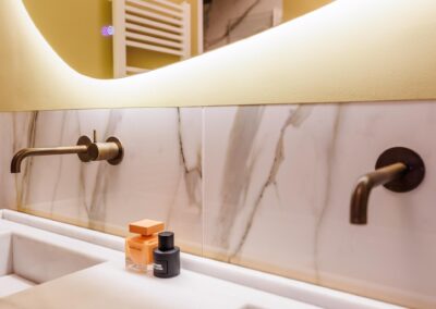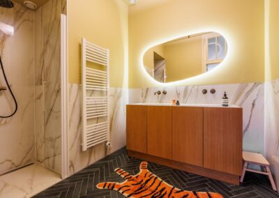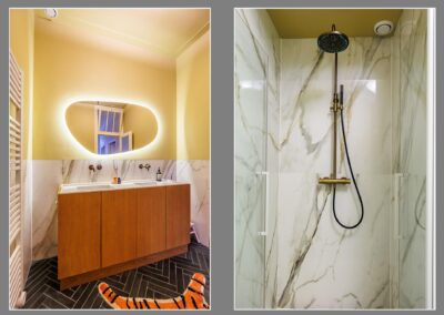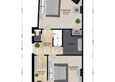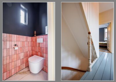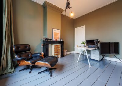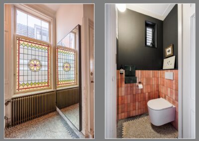 1e Verdieping: ruime overloop met eveneens een moderne toiletruimte en toegang tot 3 charmante kamers, waarvan 2 royale slaapkamers van circa 22, 16 en een werkkamer van circa 6 m². De stijlvolle en moderne badkamer is ingericht met dubbele wastafelmeubel, inloopdouche, verwarmde spiegel en designradiator.