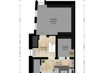 Souterrain: middels vaste trap bereikbare royaal souterrain. Deze multifunctionele kelder heeft een hoogte van circa 2,25 meter en meerdere ramen. Er is een overloop, slaap-/hobbykamer van circa 18 m², 2 bergingen aan de voorzijde en aan de achterzijde nog een grote berging-/klusruimte van circa 21 m². Deze heeft een achterdeur met een trapje naar de achtertuin. Na enkele aanpassingen uitstekend geschikt voor eventueel werken aan huis of Bed & Breakfast.