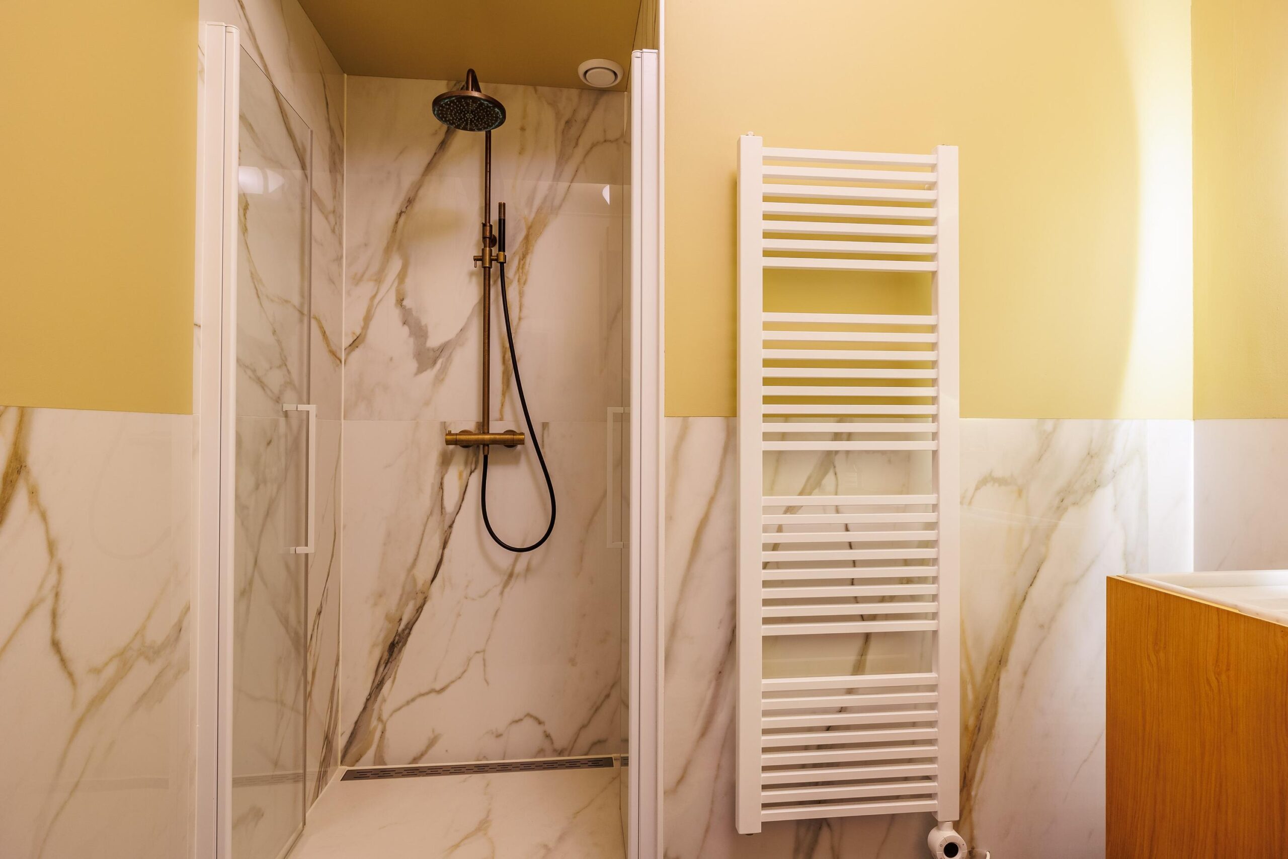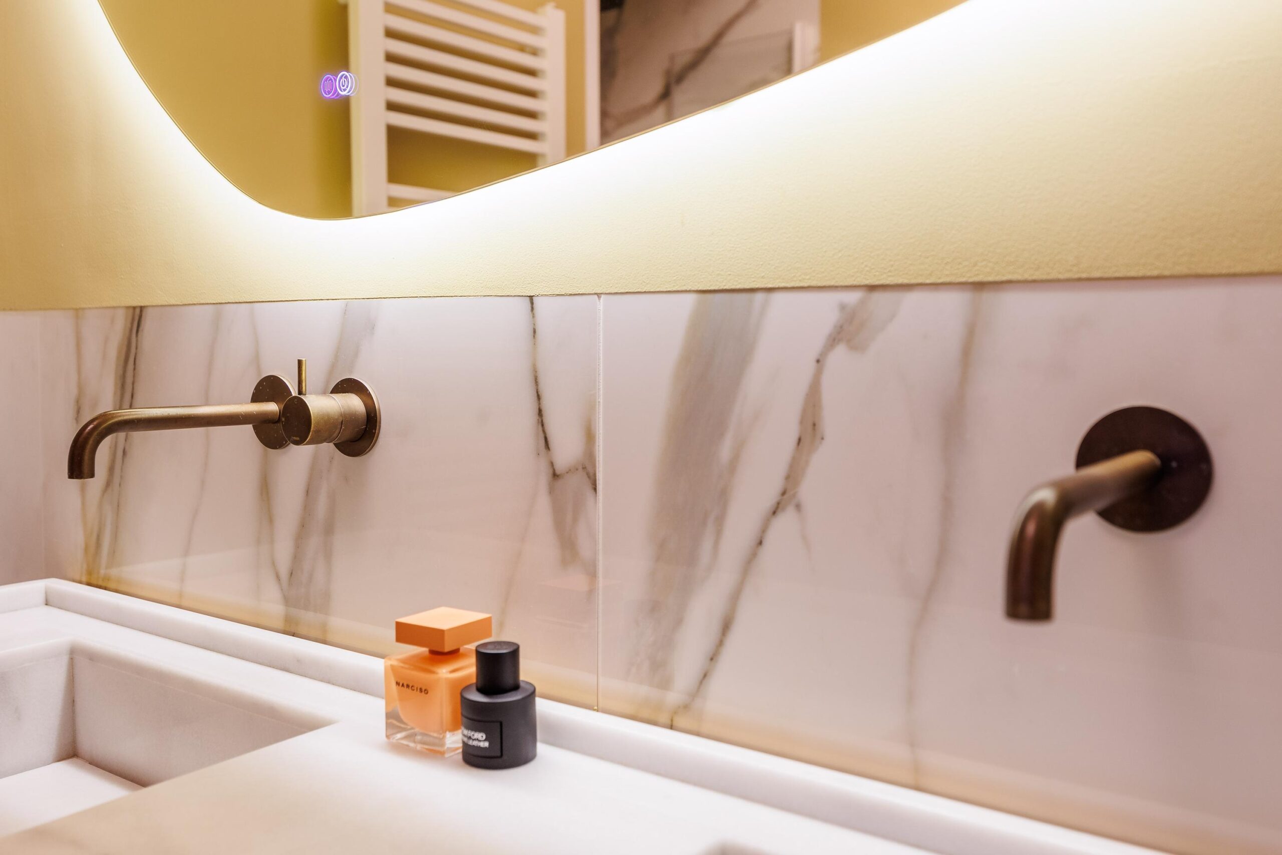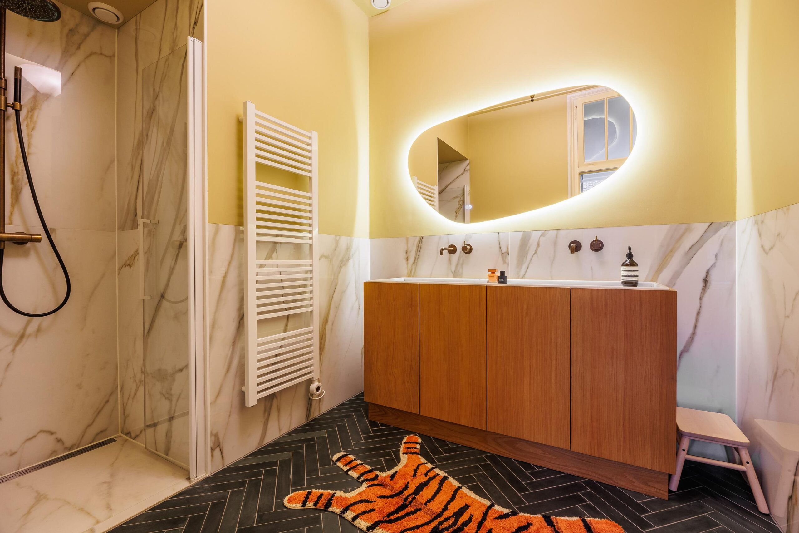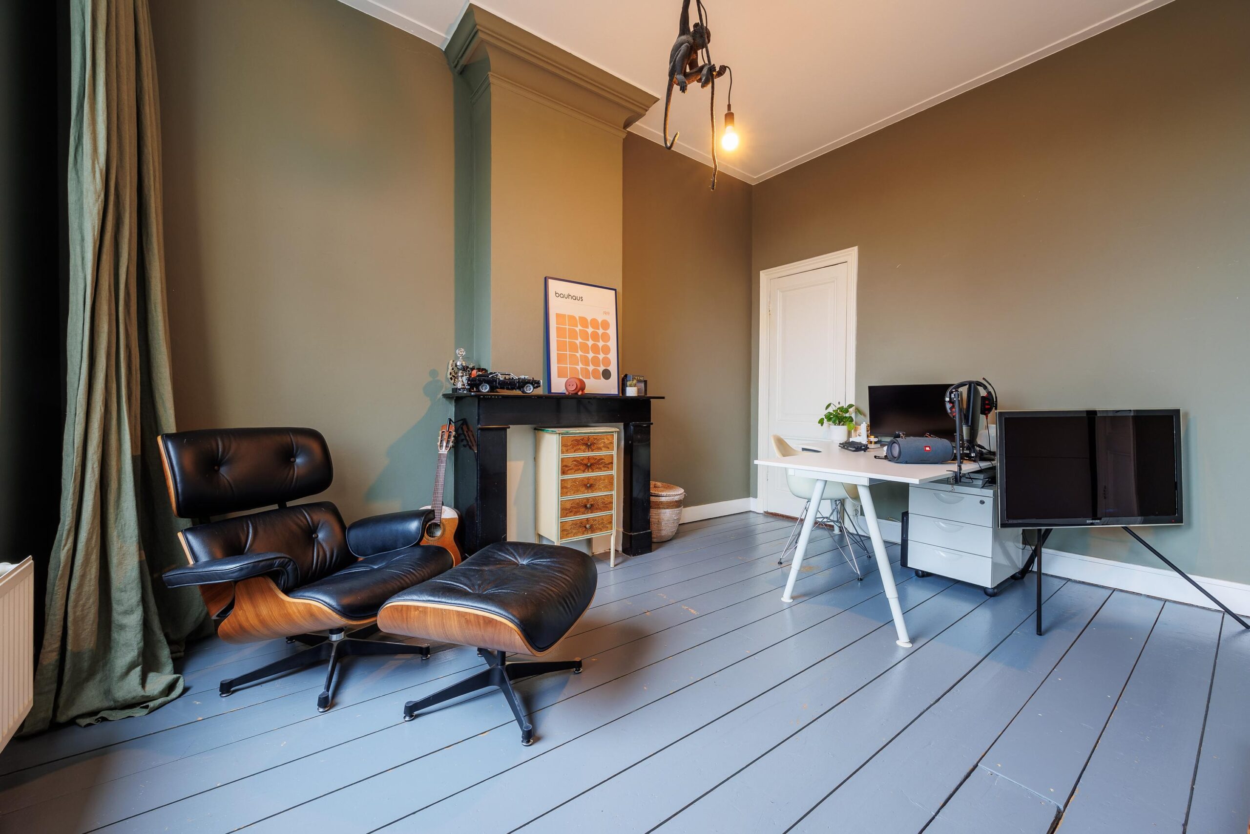 1e Verdieping: ruime overloop met eveneens een moderne toiletruimte en toegang tot 3 charmante kamers, waarvan 2 royale slaapkamers van circa 22, 16 en een werkkamer van circa 6 m². De stijlvolle en moderne badkamer is ingericht met dubbele wastafelmeubel, inloopdouche, verwarmde spiegel en designradiator.