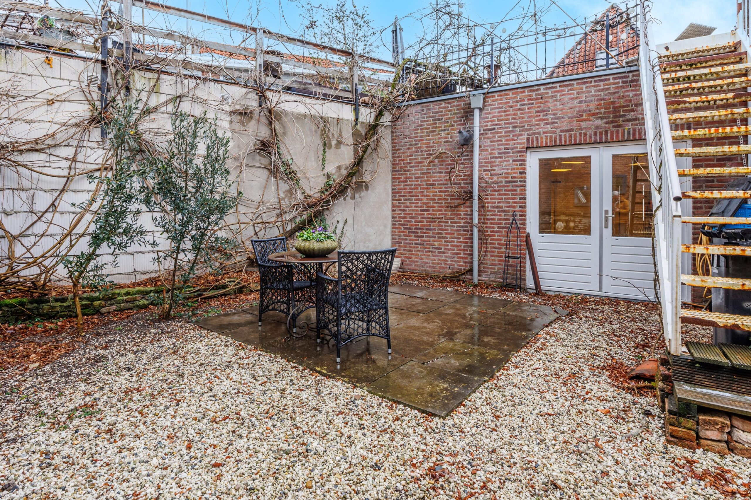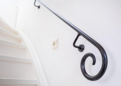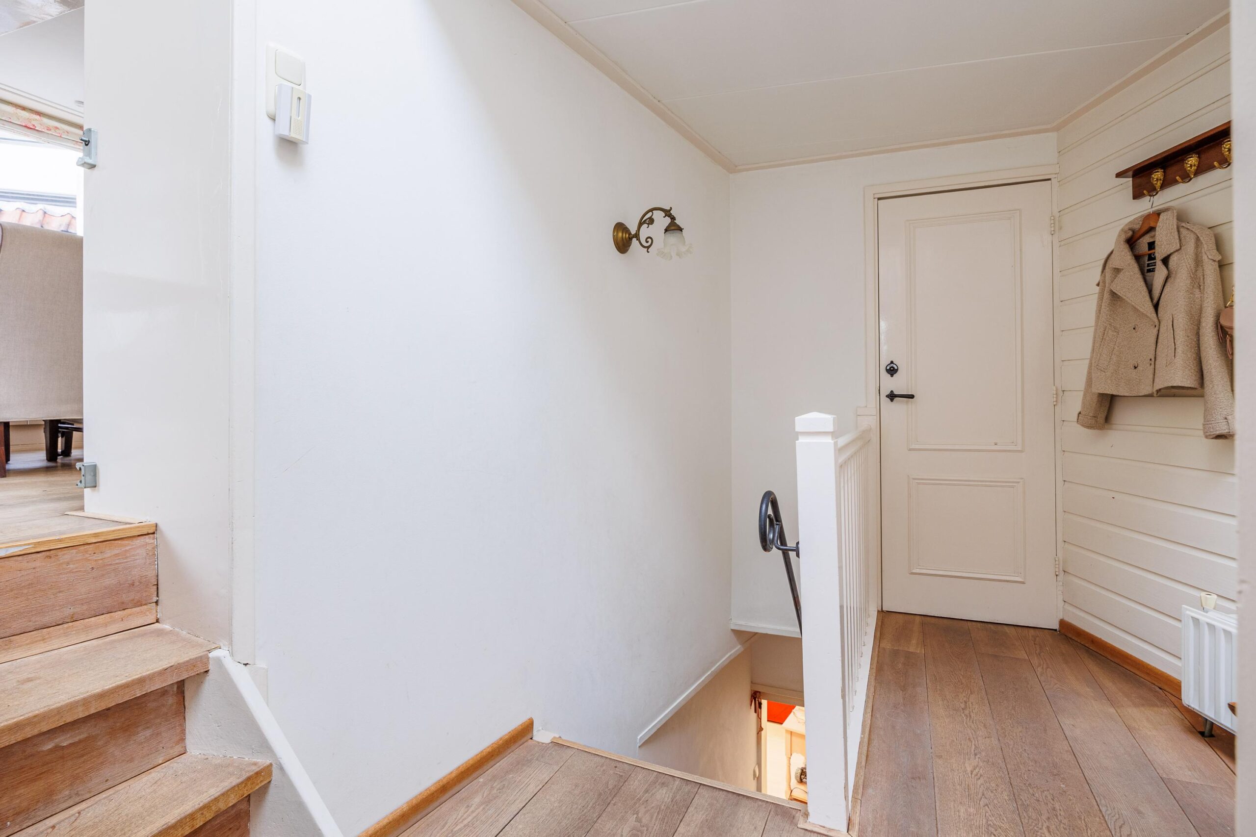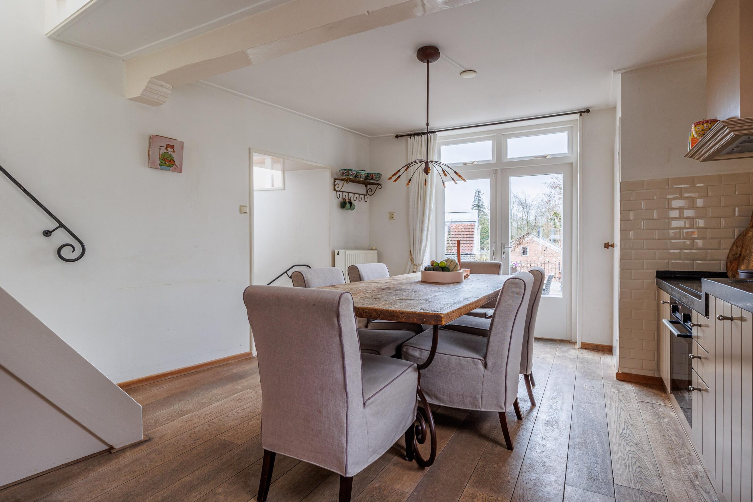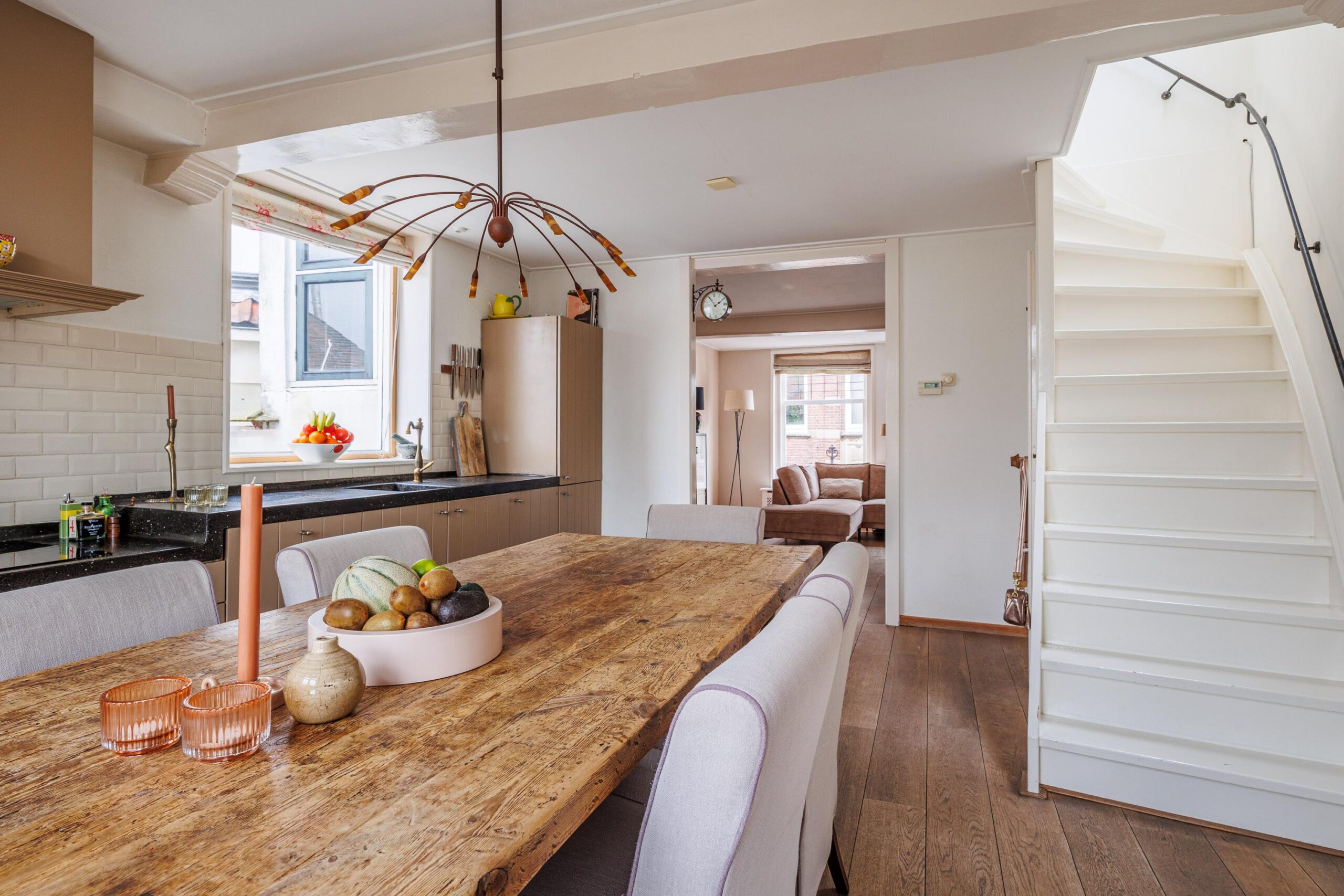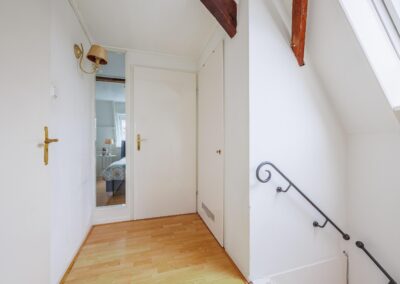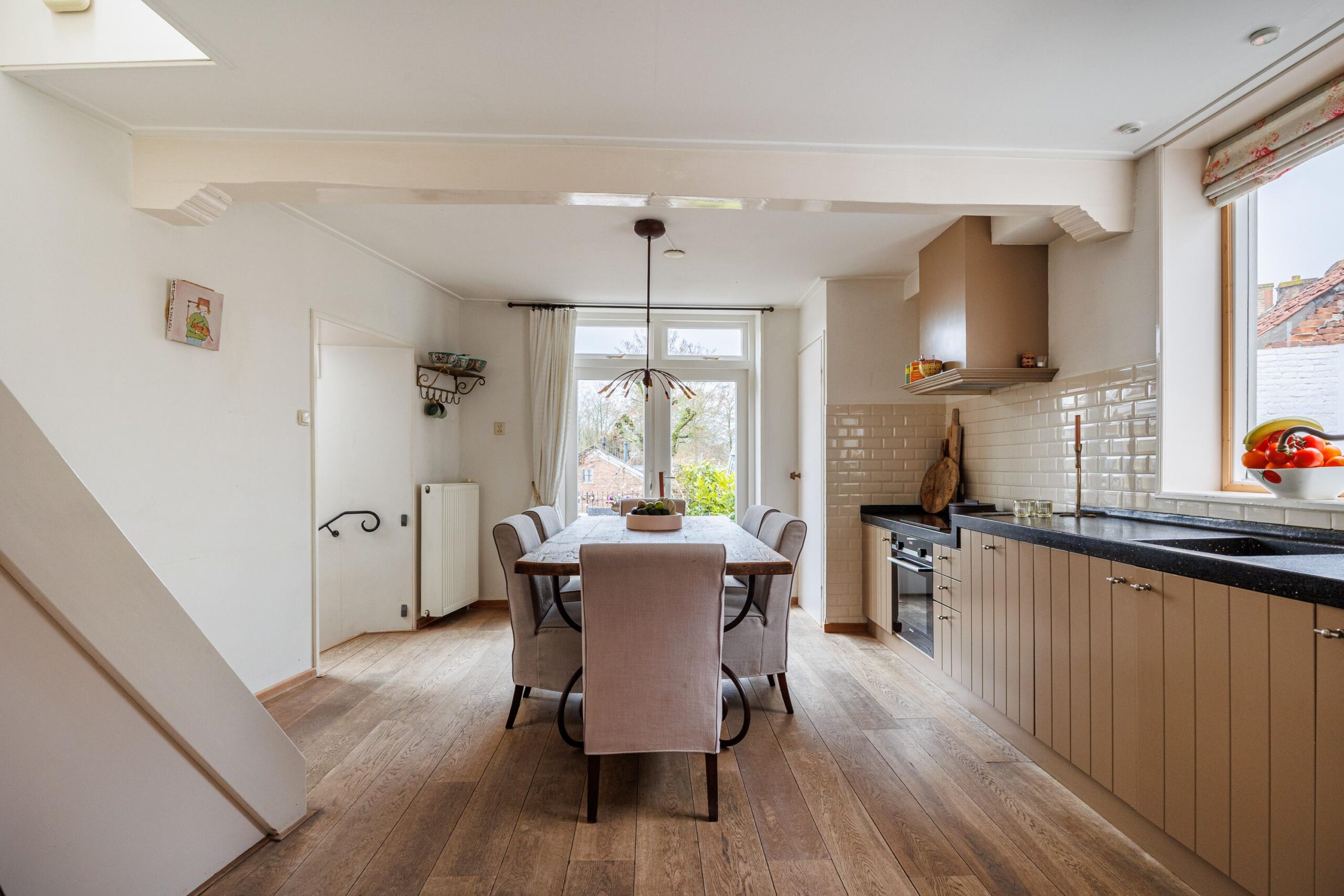 De trapopgang naar de tweede verdieping bevindt zich eveneens in de keuken, waardoor de woonlagen logisch en praktisch met elkaar zijn verbonden.