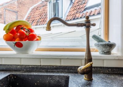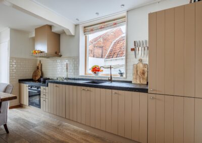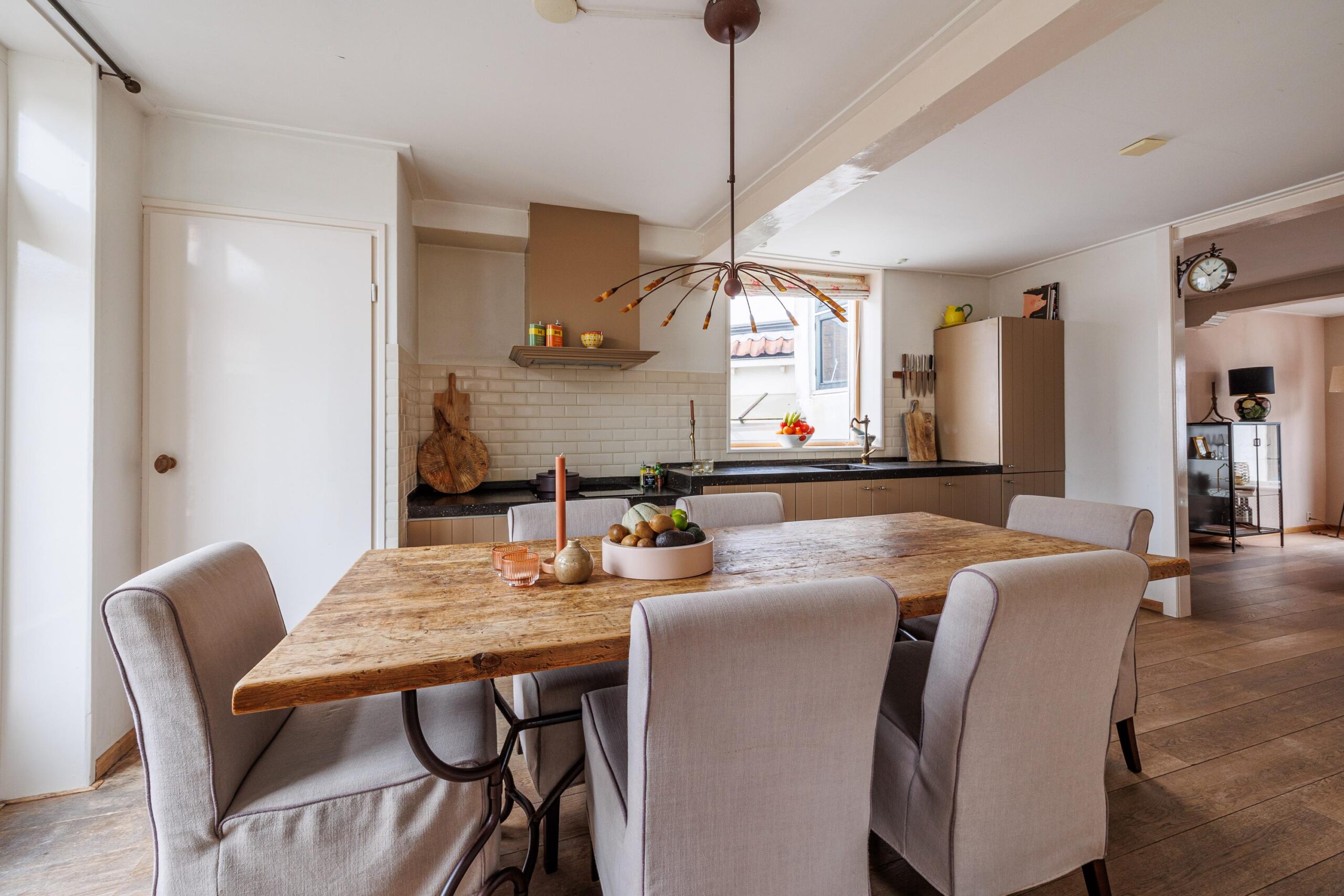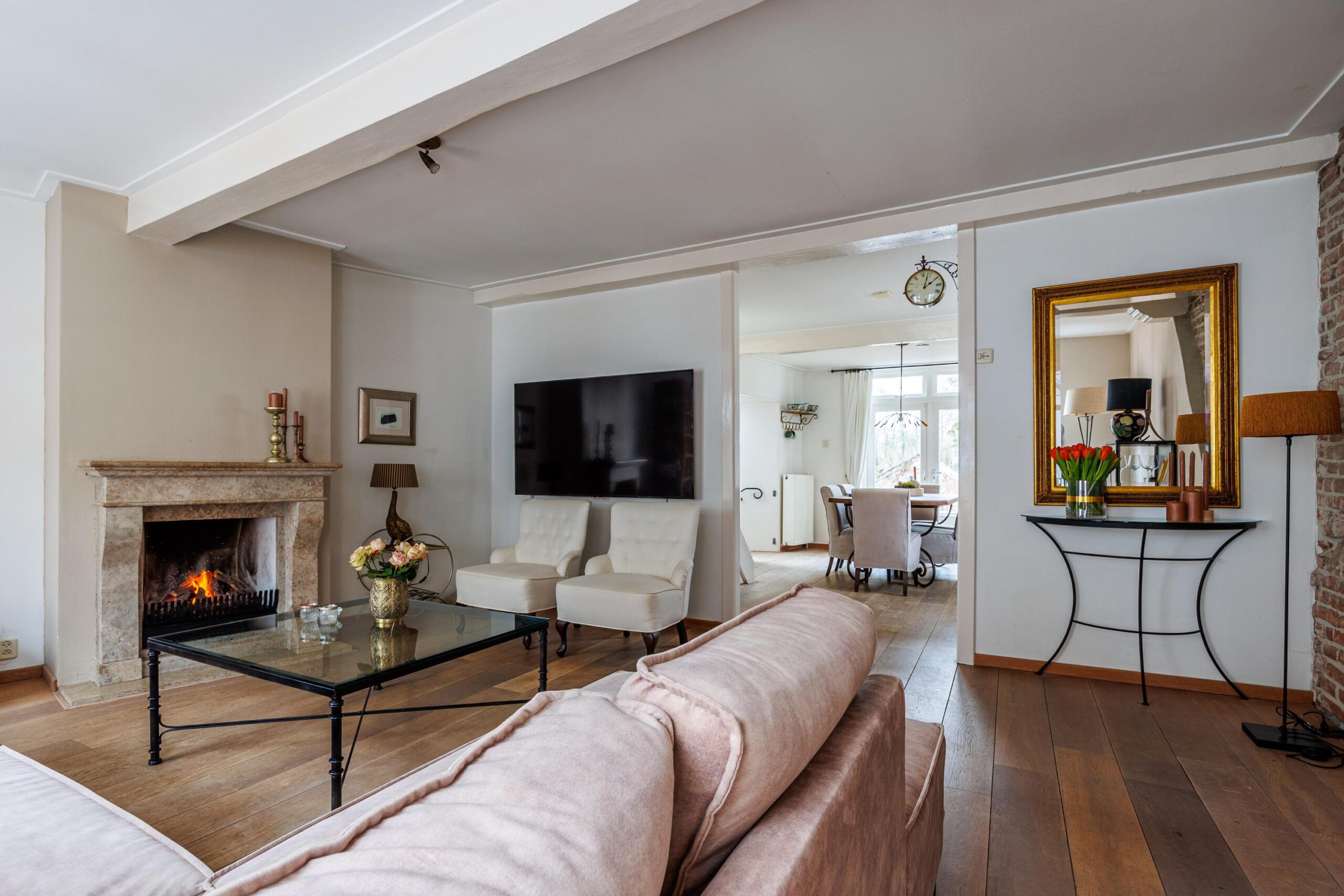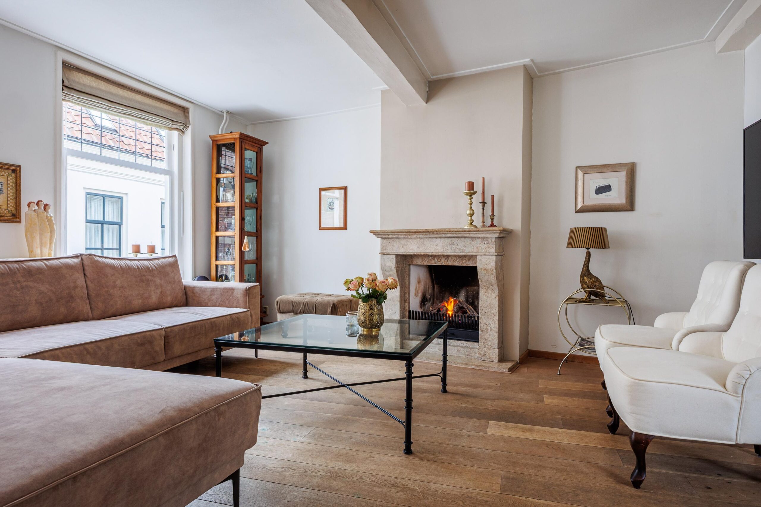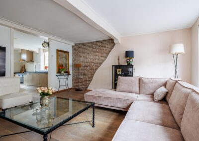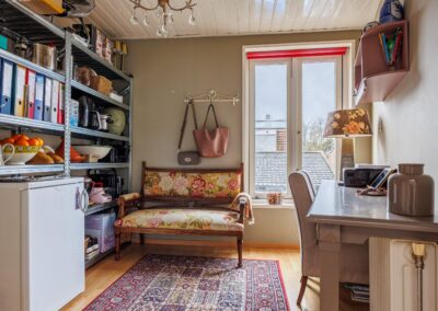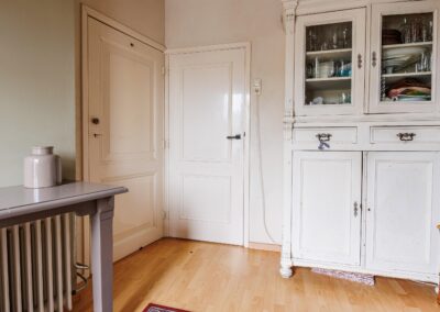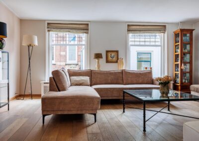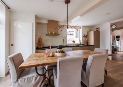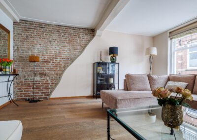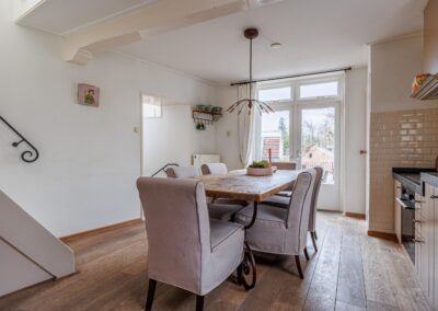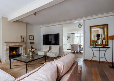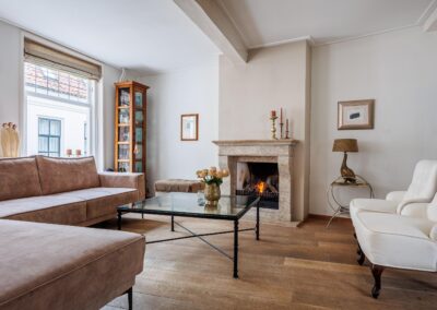 Vanuit de woonkeuken loop je door naar de sfeervolle woonkamer van 24.3m². Hier komen alle karaktereigenschappen van het pand prachtig samen: charmant, knus en rijk aan authentieke details. De ruimte ademt historie en warmte. De aanwezige gashaard zorgt niet alleen voor extra comfort, maar versterkt ook de gezellige en intieme sfeer van deze bijzondere leefruimte.