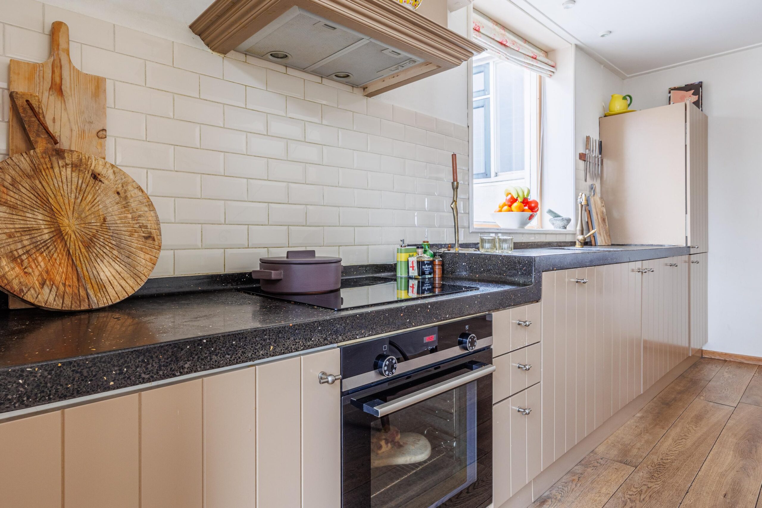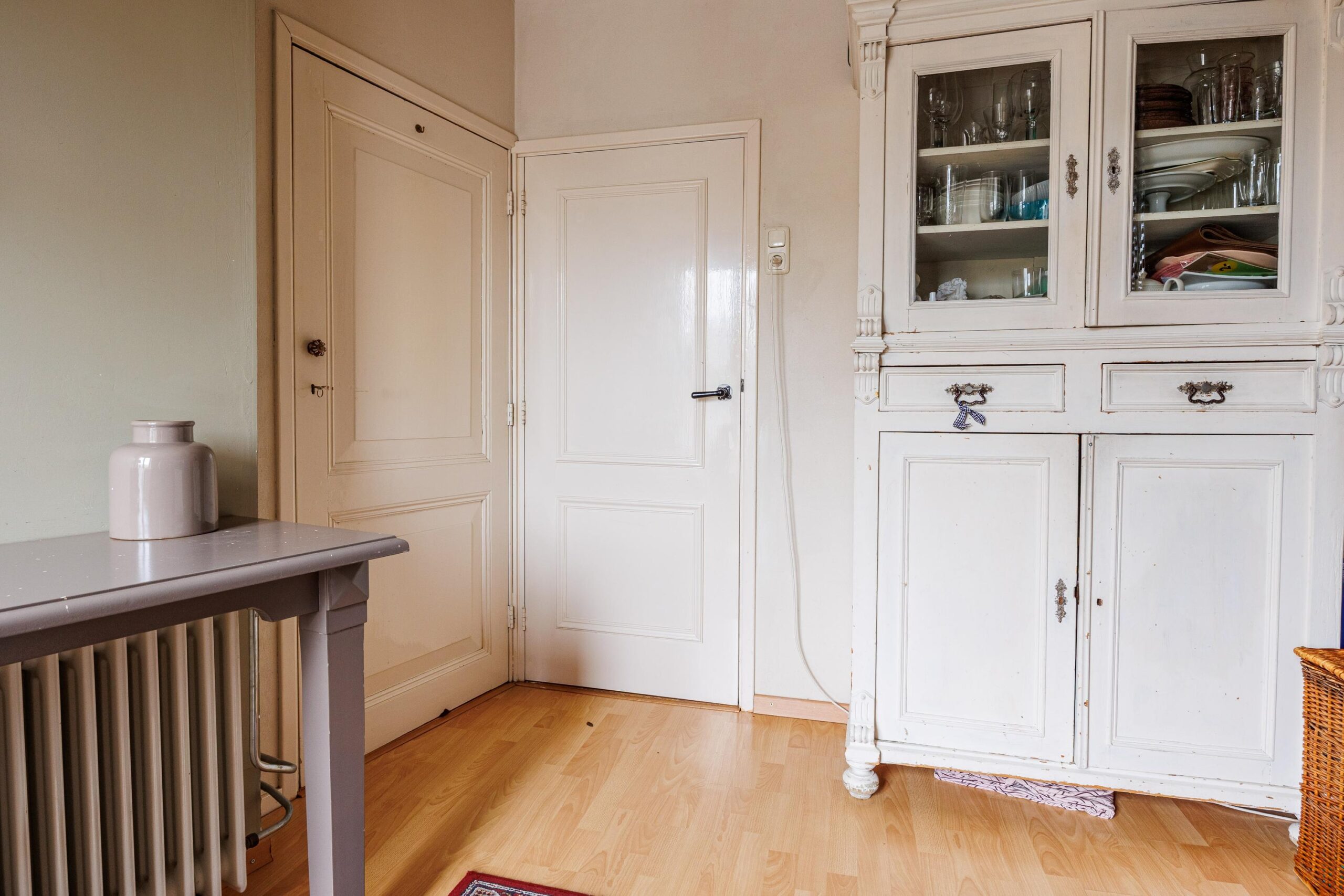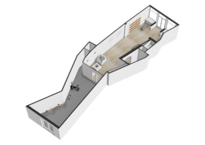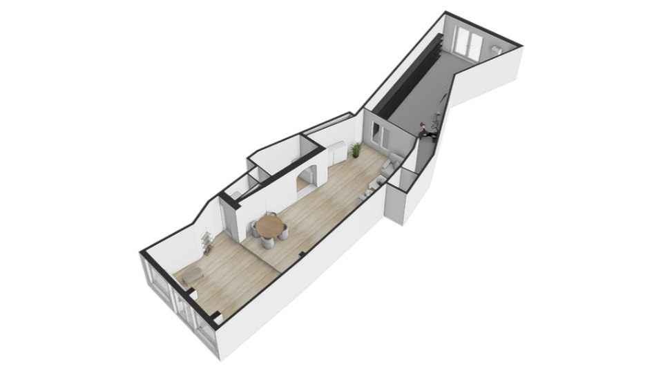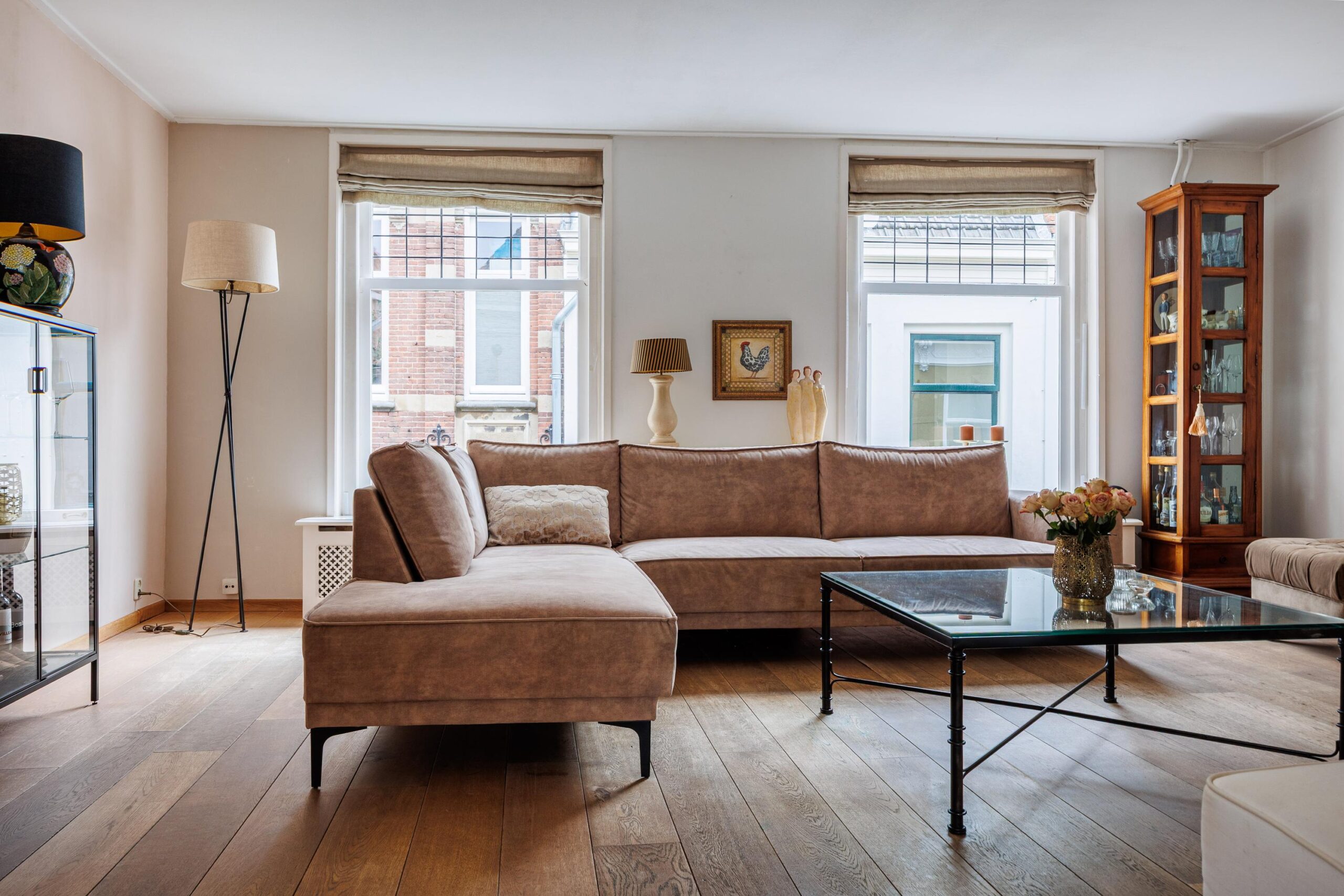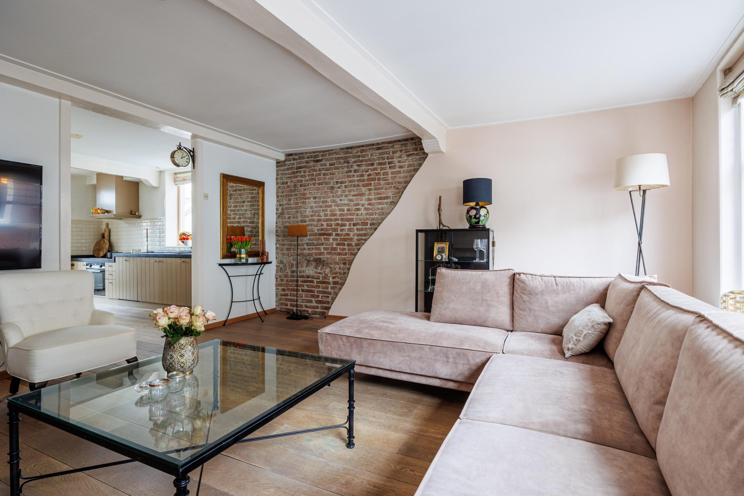 Vanuit de woonkeuken loop je door naar de sfeervolle woonkamer van 24.3m². Hier komen alle karaktereigenschappen van het pand prachtig samen: charmant, knus en rijk aan authentieke details. De ruimte ademt historie en warmte. De aanwezige gashaard zorgt niet alleen voor extra comfort, maar versterkt ook de gezellige en intieme sfeer van deze bijzondere leefruimte.