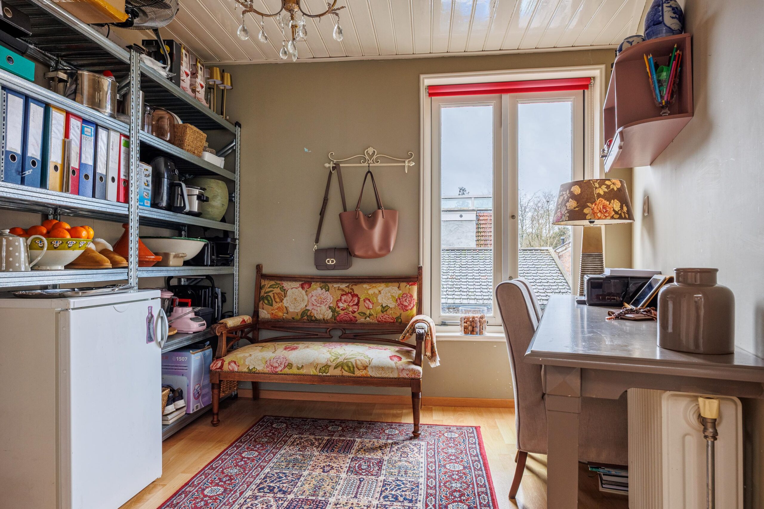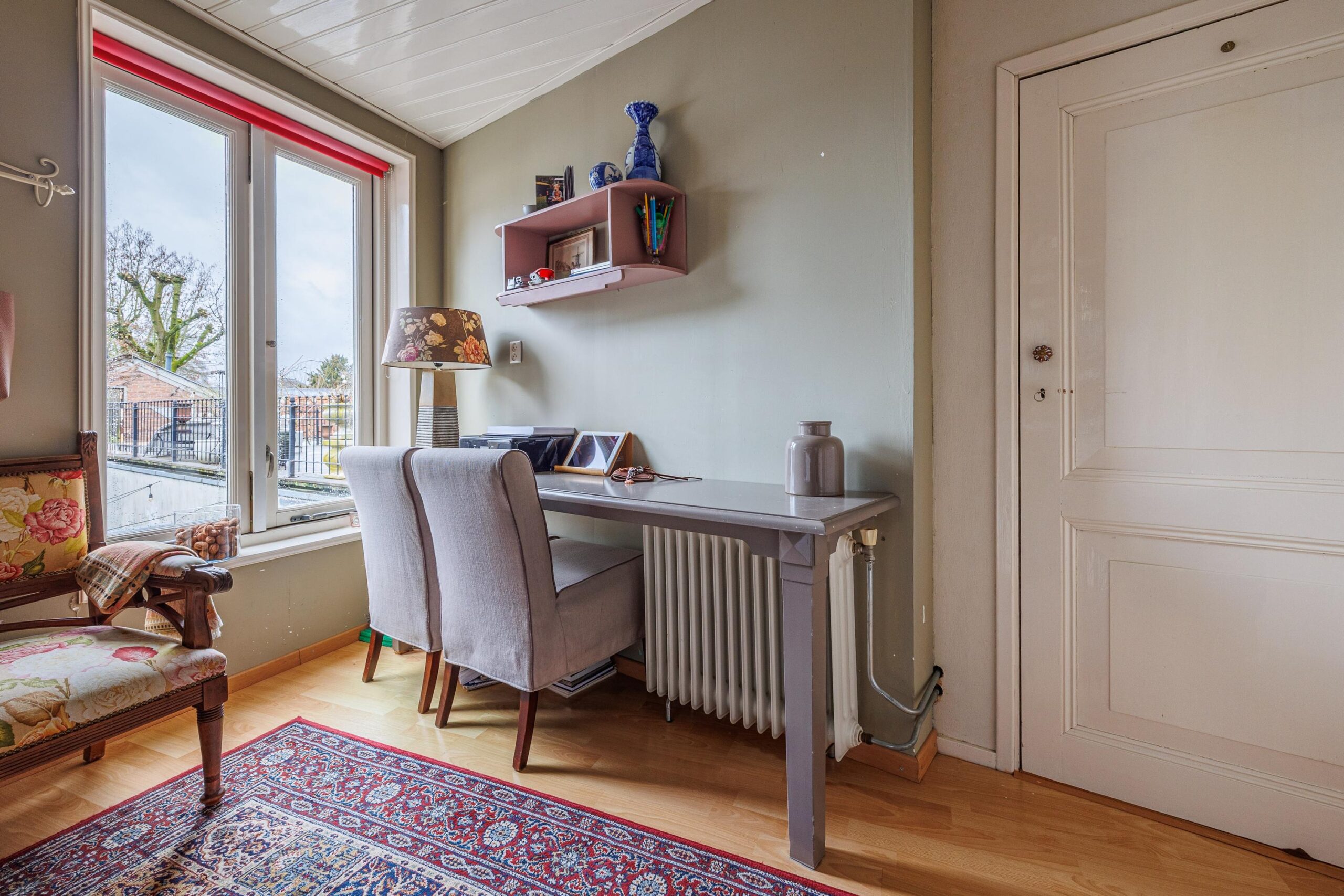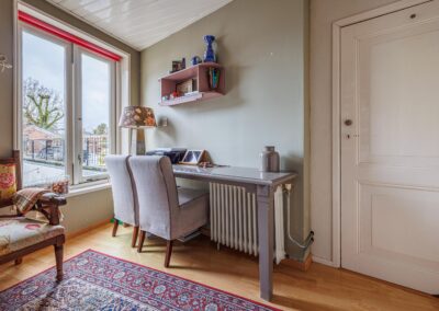 Eerste verdieping: Via een kleine tussenverdieping bereik je de eerste verdieping. Hier bevindt zich een werkkamer/studeerkamer van 9.3m², een prettige en rustige ruimte die zich uitstekend leent voor thuiswerken of als hobbykamer. Op deze verdieping is tevens een separaat toilet aanwezig.