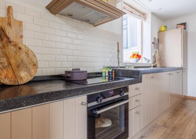 Met een korte trap kom je in het hart van de woning: de royale woonkeuken van 19.1m². Dit is een heerlijke leefruimte met volop plaats voor een grote eettafel, ideaal om uitgebreid te tafelen of gasten te ontvangen. De keuken biedt daarnaast voldoende werkruimte door de fijne indeling.