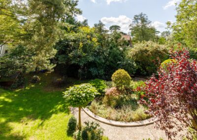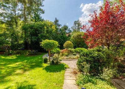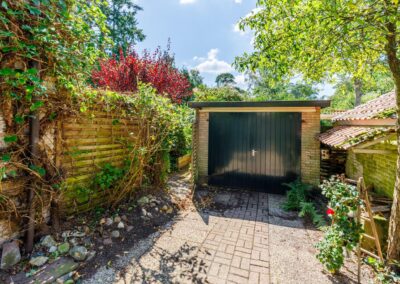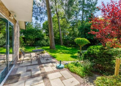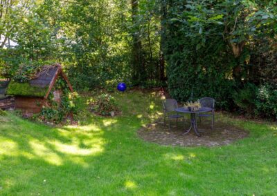 De ruime en besloten achtertuin is fraai aangelegd en gunstig gelegen op het zuidwesten. De tuin biedt voldoende plekjes om heerlijk te vertoeven in de zon, maar gelukkig is er ook voldoende beschutting en schaduw te vinden onder de bomen bij de echte hete dagen van het jaar.