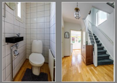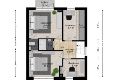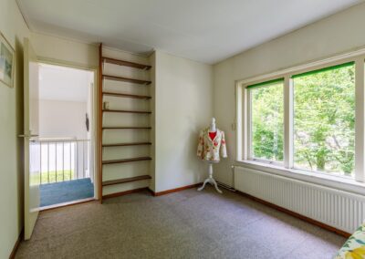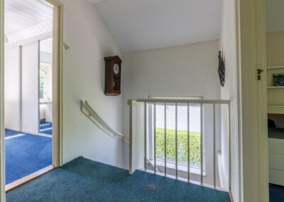 Overloop met toegang tot de 4 slaapkamers, waarvan waarvan 1 slaapkamer met een wastafel en een balkon met uitzicht op de tuin. Een van de slaapkamers heeft een grote wandkast met veel opbergruimte. Op deze etage bevinden zich ook de badkamer uitgerust met een douche en vaste wastafel en een separaat toilet.