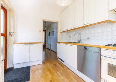 ENTREE, hal, toiletruimte, meterkast, toegang naar de kelder (stahoogte), trapopgang naar de eerste verdieping, toegang tot de ruime woonkamer met open eetgedeelte. Aparte ruimte met de keuken voorzien van opbergruimte en apparatuur, waaronder een gasfornuis met oven, koelkast en nieuwe vaatwasser uit 2023. Vanuit de keuken is er zicht op de zonnige riante achtertuin en een buitendeur naar de ruime oprit naast de woning met een stenen vrijstaande garage en schuur voorzien van elektra en radiatoren. In deze schuur staat de cv-ketel van de woning.