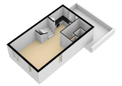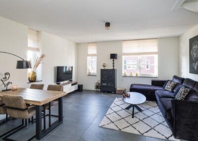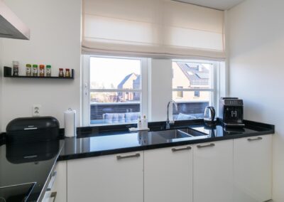 Entree via de hal met garderobe en een moderne toiletruimte. De ruime woonkamer staat in open verbinding met de moderne keuken aan de voorzijde van het appartement voorzien van inductiekookplaat met afzuigkap, vaatwasser en koel/vrieskast. Toegang tot de bovenverdieping is via de vaste trap die zich bevindt in de woonkamer. De trap heeft ook een kast met opbergruimte.