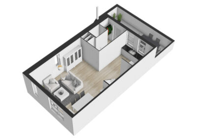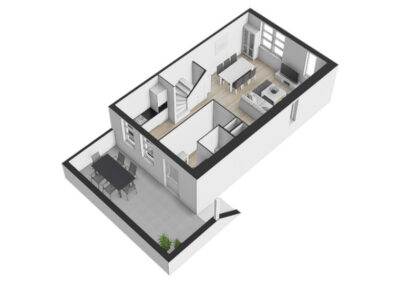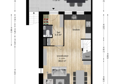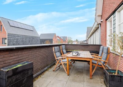 ENTREE via de buitentrap opzij van de woning, naar de voordeur op de 1e verdieping. Hier bevindt zich het heerlijke dakterras op het zuidoosten. Entree via de hal met garderobe en een moderne toiletruimte. De ruime lichte woonkamer staat in open verbinding met de moderne keuken aan de achterzijde van het appartement voorzien van gaskookplaat met afzuigkap, vaatwasser en koel/vrieskast. Toegang tot de bovenverdieping is via de vaste trap die zich bevindt in de woonkamer. Onder de trap vindt een kast met opbergruimte.