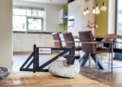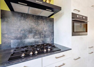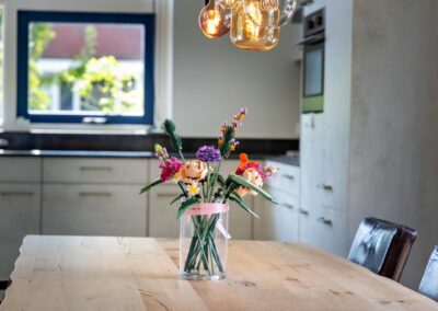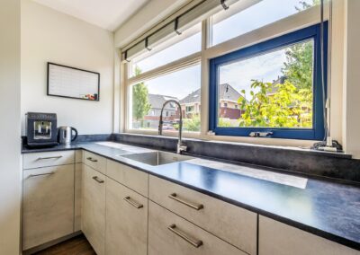 De benedenverdieping is voorzien van vloerverwarming, zodat u het hele jaar door geniet van aangename warmte. Zowel de woonkamer als het eetgedeelte zijn voorzien van openslaande deuren en raampartijen, wat ervoor zorgt dat de tuin een verlengstuk van de keuken en van de kamer is en veel lichtinval geeft in de woning. Aansluitend vindt u de open keuken met inbouwapparatuur.