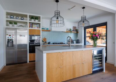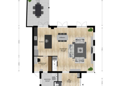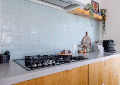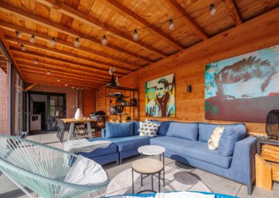 Het keukeneiland is dé eyecatcher van de woonkamer. Deze luxe keuken is met de houten lades en het betonnen blad niet alleen een plaatje voor het oog, ook is hij van alle gemakken voorzien, onder andere een kokend waterkraan, 5-pits gasfornuis, oven, magnetron, vaatwasser en zelfs een wijnklimaatkast! De Marokkaanse Zelliges met daarboven een houten plank met spotjes erin zorgen voor een fraaie sfeer in deze ruimte. Het keukeneiland is aan beiden weerszijden voorzien van lades, die al met al in veel bergruimte voorzien. Vanuit de keuken geven openslaande deuren toegang tot de sfeervolle tuinkamer van maar liefst 32 m2 – een natuurlijke verlenging van het buitenleven, waar binnen en buiten naadloos in elkaar overlopen. Ook is via de openslaande deuren bij het eetgedeelte de achtertuin bereikbaar.