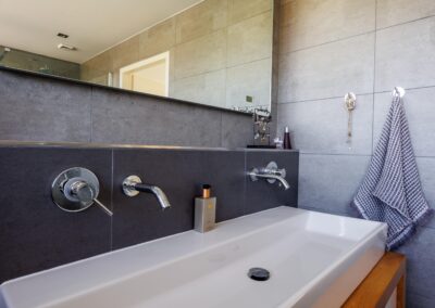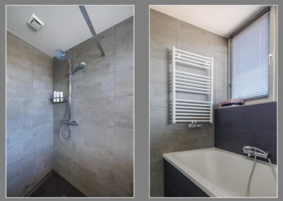 De badkamer is voorzien van een inloopdouche, ligbad, dubbele wastafel en designradiator.