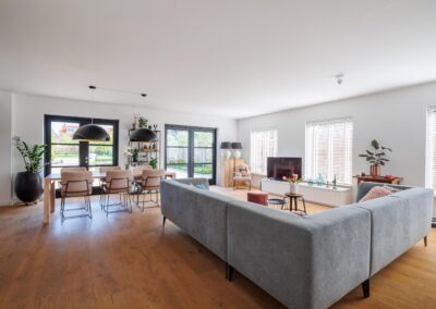 Verscholen achter de Rijksstraatweg ligt deze bijzondere woning. Bij binnenkomst in de woonkamer vanuit de royale hal, valt direct het overvloedige daglicht op door de drie maal openslaande deuren en vele raampartijen. De woonkamer is ruim opgezet en heeft een warme houten vloer die zorgt voor een gezellige sfeer. De gehele benedenverdieping is voorzien van vloerverwarming. De open indeling verbindt de gezellige zithoek moeiteloos met de eetruimte, waardoor het een ideale plek is voor zowel dagelijks comfort als sociale momenten.