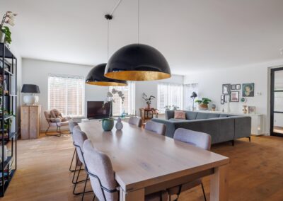Verscholen achter de Rijksstraatweg ligt deze bijzondere woning. Bij binnenkomst in de woonkamer vanuit de royale hal, valt direct het overvloedige daglicht op door de drie maal openslaande deuren en vele raampartijen. De woonkamer is ruim opgezet en heeft een warme houten vloer die zorgt voor een gezellige sfeer. De gehele benedenverdieping is voorzien van vloerverwarming. De open indeling verbindt de gezellige zithoek moeiteloos met de eetruimte, waardoor het een ideale plek is voor zowel dagelijks comfort als sociale momenten.