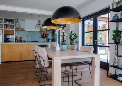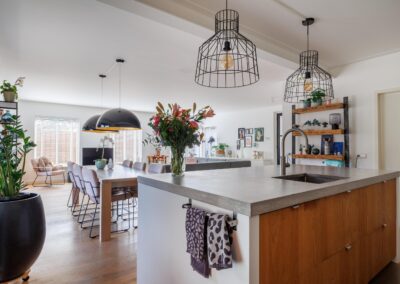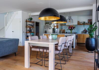 Het keukeneiland is dé eyecatcher van de woonkamer. Deze luxe keuken is met de houten lades en het betonnen blad niet alleen een plaatje voor het oog, ook is hij van alle gemakken voorzien, onder andere een kokend waterkraan, 5-pits gasfornuis, oven, magnetron, vaatwasser en zelfs een wijnklimaatkast! De Marokkaanse Zelliges met daarboven een houten plank met spotjes erin zorgen voor een fraaie sfeer in deze ruimte. Het keukeneiland is aan beiden weerszijden voorzien van lades, die al met al in veel bergruimte voorzien. Vanuit de keuken geven openslaande deuren toegang tot de sfeervolle tuinkamer van maar liefst 32 m2 – een natuurlijke verlenging van het buitenleven, waar binnen en buiten naadloos in elkaar overlopen. Ook is via de openslaande deuren bij het eetgedeelte de achtertuin bereikbaar.