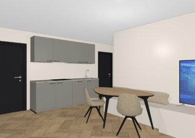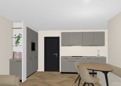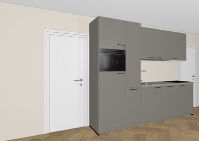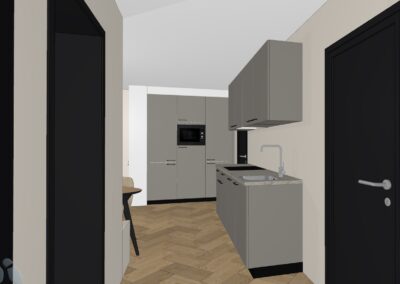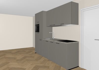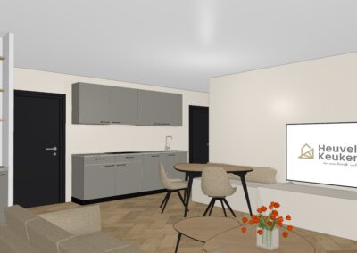 • Kies alleen nog je eigen keuken en vloerafwerking. De keuken uit de voorbeeldimpressie is afneembaar bij Heuvelrug Keukens voor € 6.096,45 (optie 1 met kastenwand tegen de linkermuur erbij, exclusief montage en ombouw) of € 4.412,68 (optie 2 excl. montage).