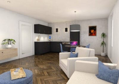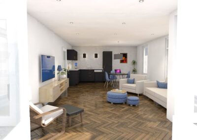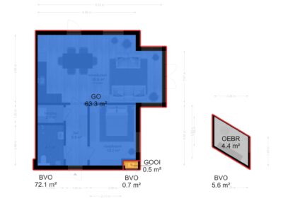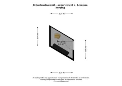 Begane grond: ENTREE, gezamenlijke hal, toegang tot eigen appartement. Hal met toegang tot de ruime en lichte woonkamer met open keuken (gezamenlijk groot 36m²). De woonkamer heeft een erker aan de voorzijde van het gebouw, wat zorgt voor goede lichtinval en vrij zicht op de Rijksstraatweg. Middels openslaande deuren bereiken we het zonneterras met ligging op het zuiden! De open keuken is voorzien van aansluitingen voor een nieuwe keuken naar keuze (met stelpost van € 5.000,–). Vanuit de hal zijn tevens de slaapkamer van 12 m², de betegelde badkamer met douche, wastafel en zwevend toilet en een separate was-/c.v. ruimte bereikbaar. Vanuit de woonkamer/keuken is een extra tuindeur naar de privé parkeerplaats en een vrijstaande berging. De ruimtes zijn voorzien van vloerverwarming, gestuukte wande, inbouwspots in het plafond.