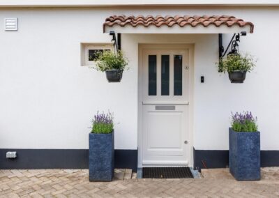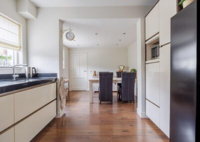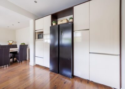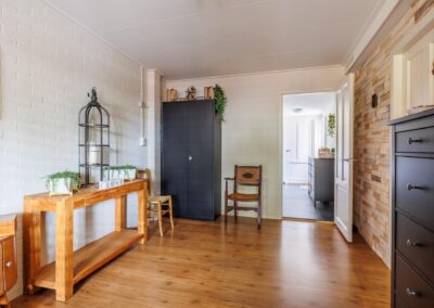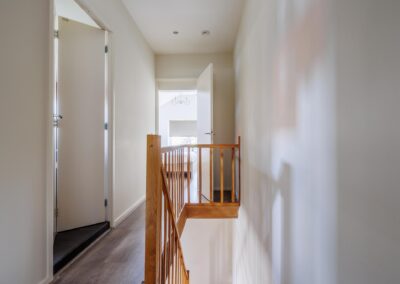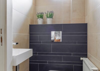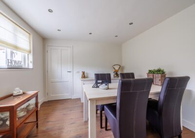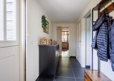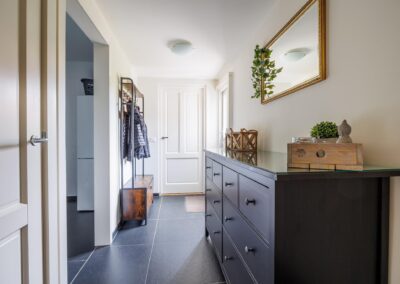 De woonkamer loopt door naar een ruime entreehal, die toegang biedt tot zowel een separaat toilet als tot de kelder en de gezellige woonkeuken. Tevens is hier ruimte voor een thuiswerkplek.