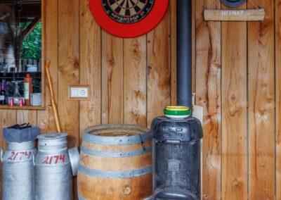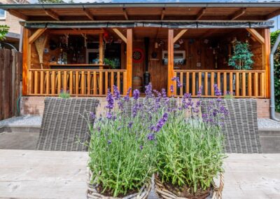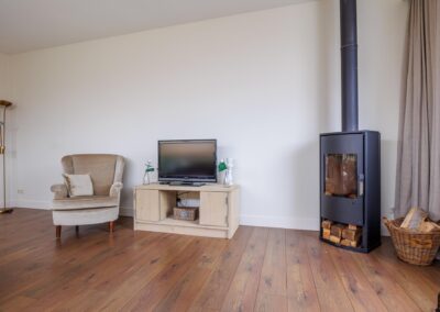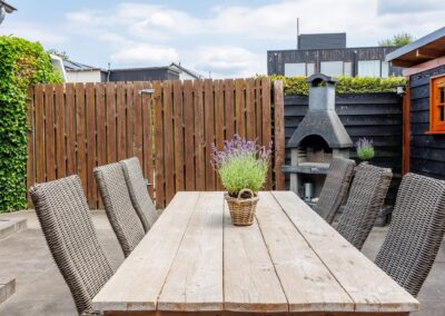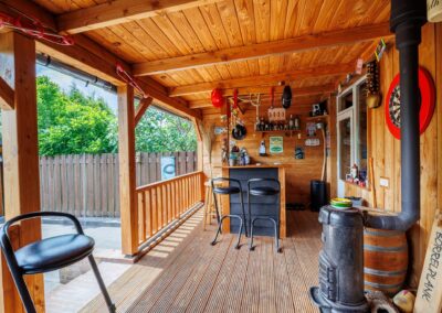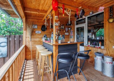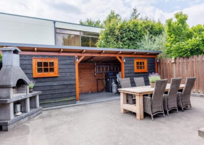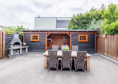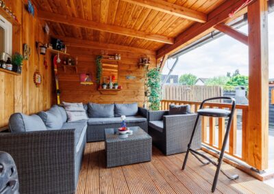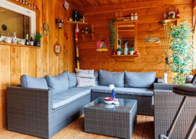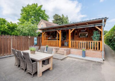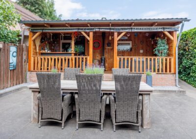 Via de achterdeur loopt u zo de op het zuiden gelegen veranda op. Hier is het heerlijk beschut zitten in zowel de zomer- als in de wintermaanden, mede dankzij de gezellige houtkachel en het windscherm. Nodig wat vrienden uit voor een gezellige avond in de bar op de veranda.