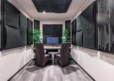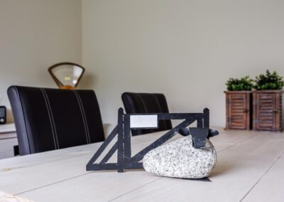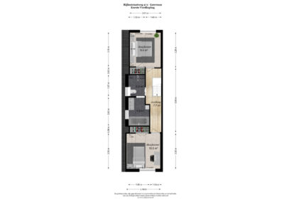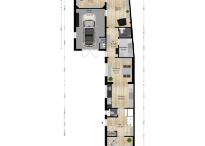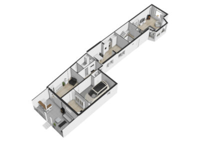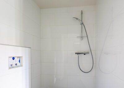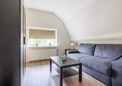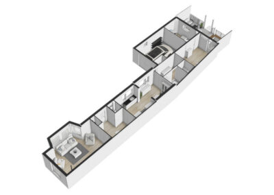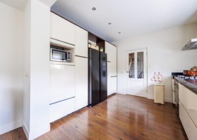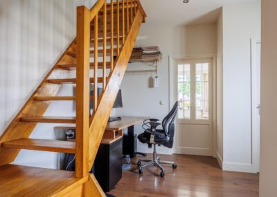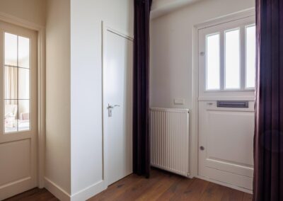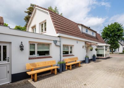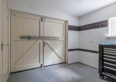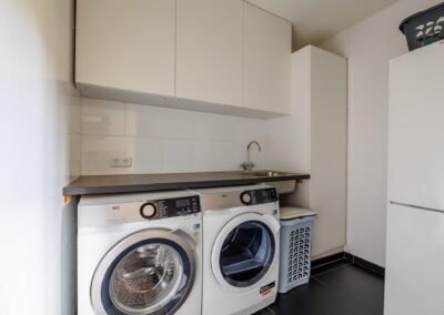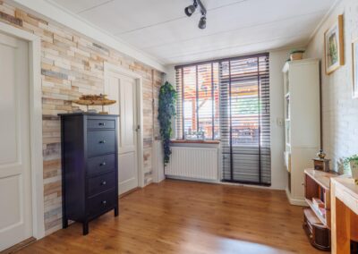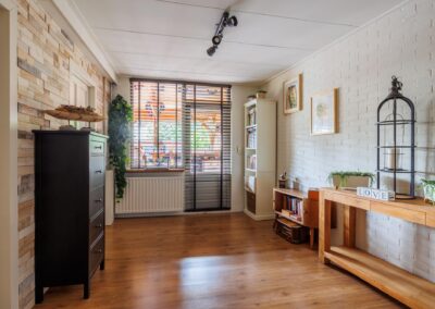 Aangrenzend vind u een praktische bijkeuken met aansluitingen voor de wasmachine en droger. In de ruimte is een douche en zijn alvast aansluitingen voorbereid voor een toilet om deze ruimte als tweede badkamer te gebruiken. Achterin de woning bevindt zich een royale multifunctionele ruimte met eigen ingang – perfect voor een kantoor aan huis of hobbyruimte. Naast deze ruimte is een kamer als studio ingericht.
