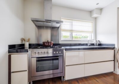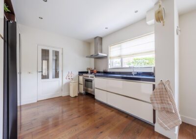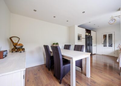 De keuken is het hart van het huis en uitgerust met moderne voorzieningen zoals een vaatwasser, 5-pits gasfornuis, koelkast, een magnetron, veel opbergruimte en een luxe stenen aanrechtblad. Het aansluitende eetgedeelte is ideaal voor lange avonden tafelen met vrienden of familie.