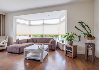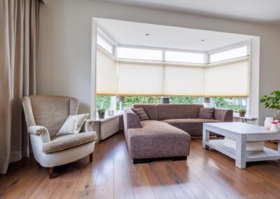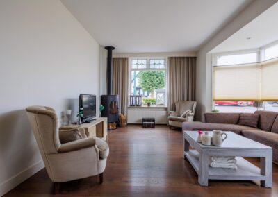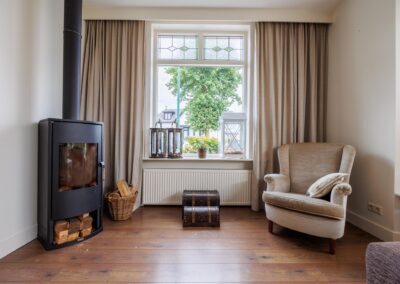 Stap binnen in een verrassend ruime en lichte woning waar sfeer en karakter moeiteloos samenkomt. De royale living is afgewerkt met een warme laminaatvloer en een sfeervolle houtkachel. De vele raampartijen en de grote erker zorgen voor veel lichtinval in deze ruimte. Het kozijn is in 2024 vernieuwd en ook zijn er glas-in-lood ramen ingezet, wat zorgt voor een karaktervolle uitstraling.
