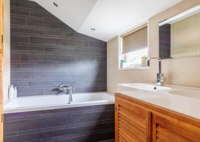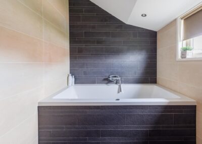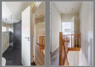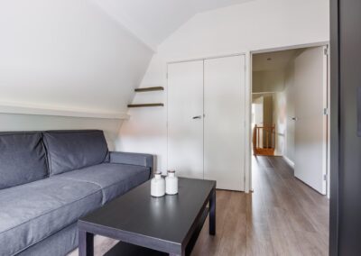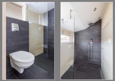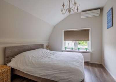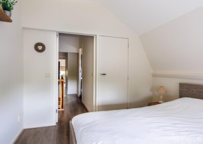 Op de eerste verdieping bevinden zich twee ruime slaapkamers, elk met inbouwkasten en tv-aansluiting. De badkamer is een oase van rust: licht, modern en compleet met vloerverwarming, whirlpool, dubbele wastafel, toilet en een luxe regendouche. De badkamer beschikt over een breed dakkapel.