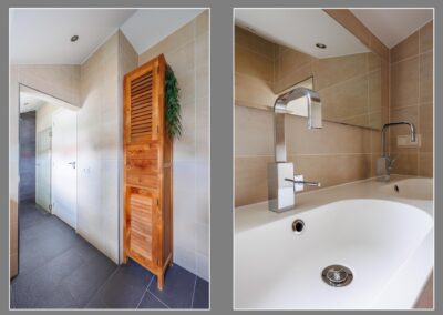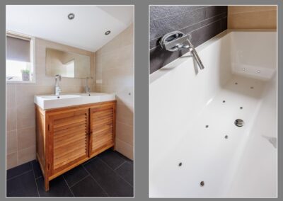 Eerste verdieping: Via vaste trap naar 1e verdieping waar zich 2 slaapkamers bevinden, op beide kamers is er een ruime inbouwkast gecreëerd en zijn aansluitingen voor tv en internet aanwezig. Moderne lichte badkamer met ruime stortdouche, toilet, 2 wastafels, whirlpool en vloerverwarming.