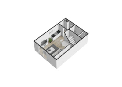 ENTREE, meterkast, CV (eigendom). Badkamer uitgerust met douche, wastafel en toilet. Woonkamer met schuifpui en inbouwkast. Open keukenblok. Trappenkast.