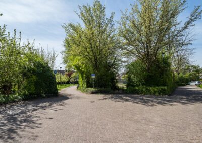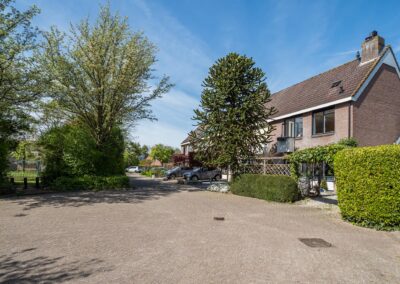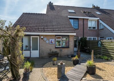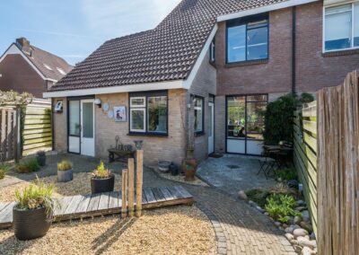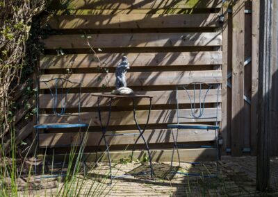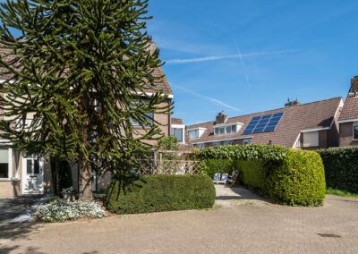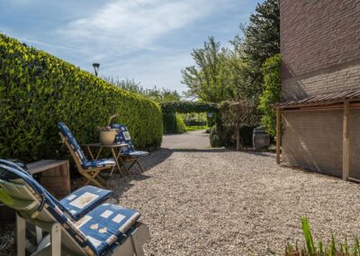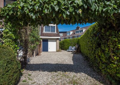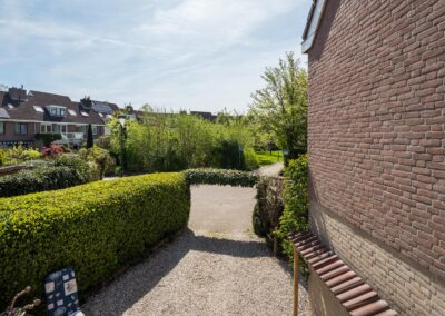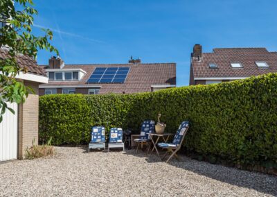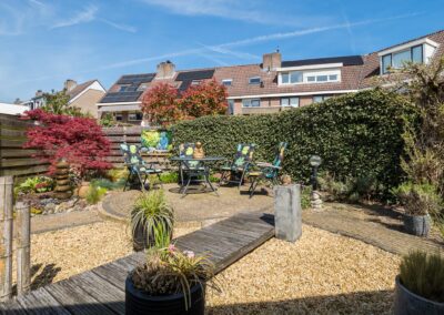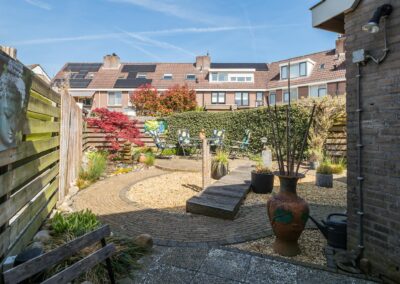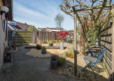 De achtertuin, gunstig gelegen op het noorden, is ingericht met verschillende zitjes en borders waar van ’s ochtends vroeg tot ’s avonds laat kan worden genoten van de zon en is er een achterom. Aan de voorzijde van de tuin is er mogelijkheid tot parkeren op eigen terrein.