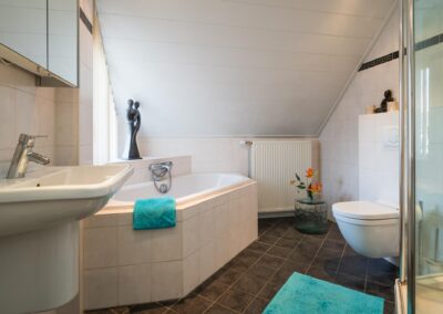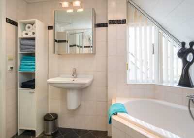 Overloop met toegang tot een ruime slaapkamer van circa 21,9 m² met klein balkon aan de voorzijde van de woning en een slaapkamer aan de achterzijde van circa 7,2 m². De badkamer is fraai ingericht met een hoekbad, douche, tweede toilet en wastafel.